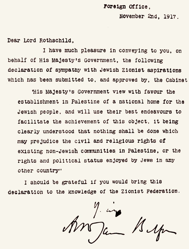 ‘O Governo de Sua Majestade enxerga favoravelmente o estabelecimento na Palestina de um lar nacional para o povo judeu, e usará seus melhores esforços para facilitar a conquista desse objetivo, estando bem claro que nada será feito que prejudique os direitos civis e religiosos das comunidades não-judaicas da Palestina, ou os direitos e status político usufruído pelos judeus em qualquer outro país’.