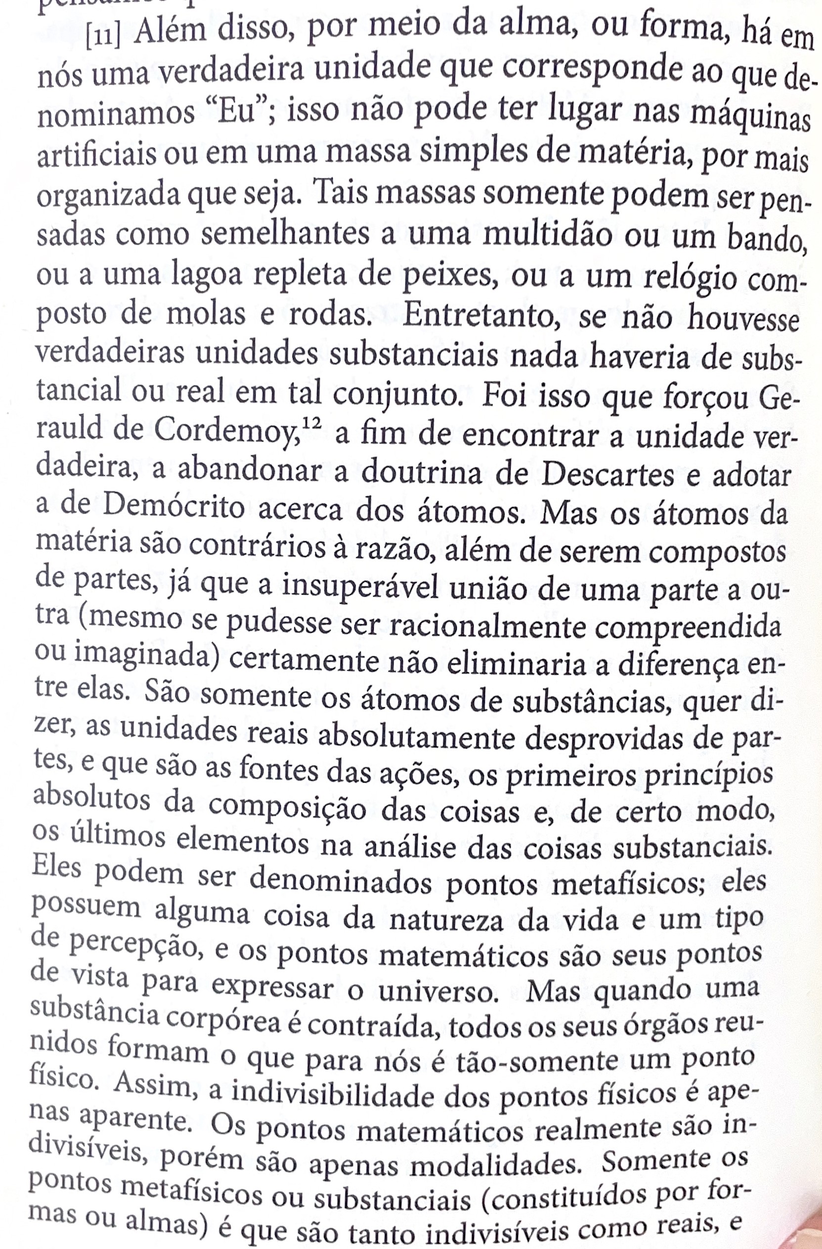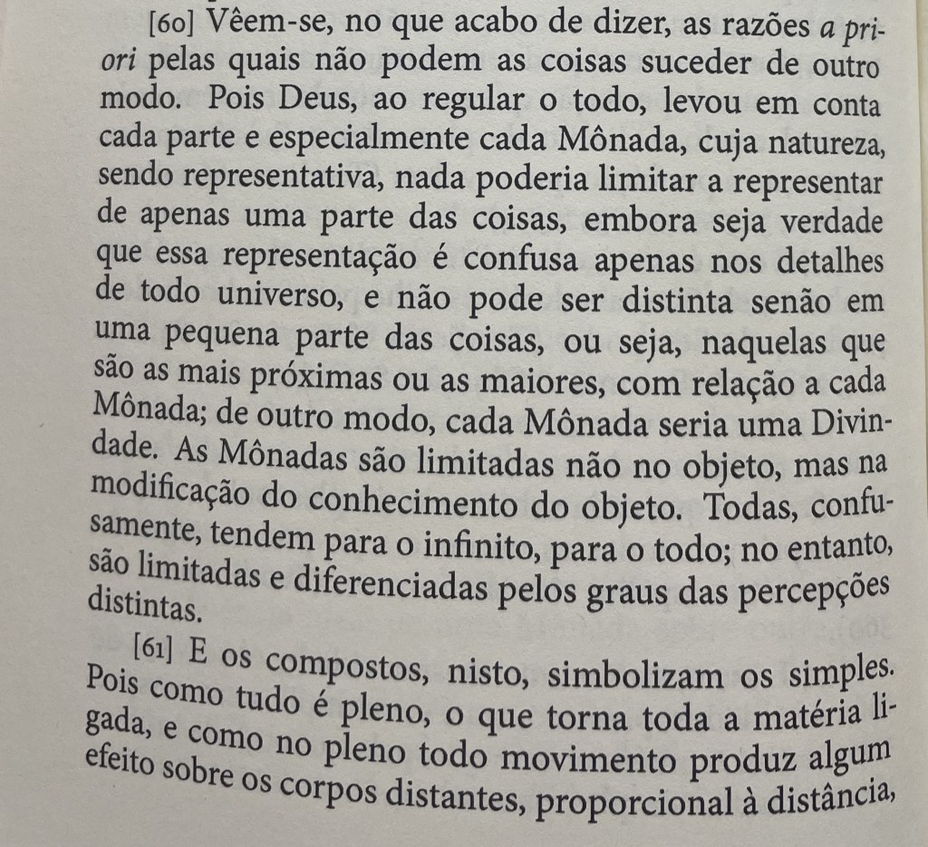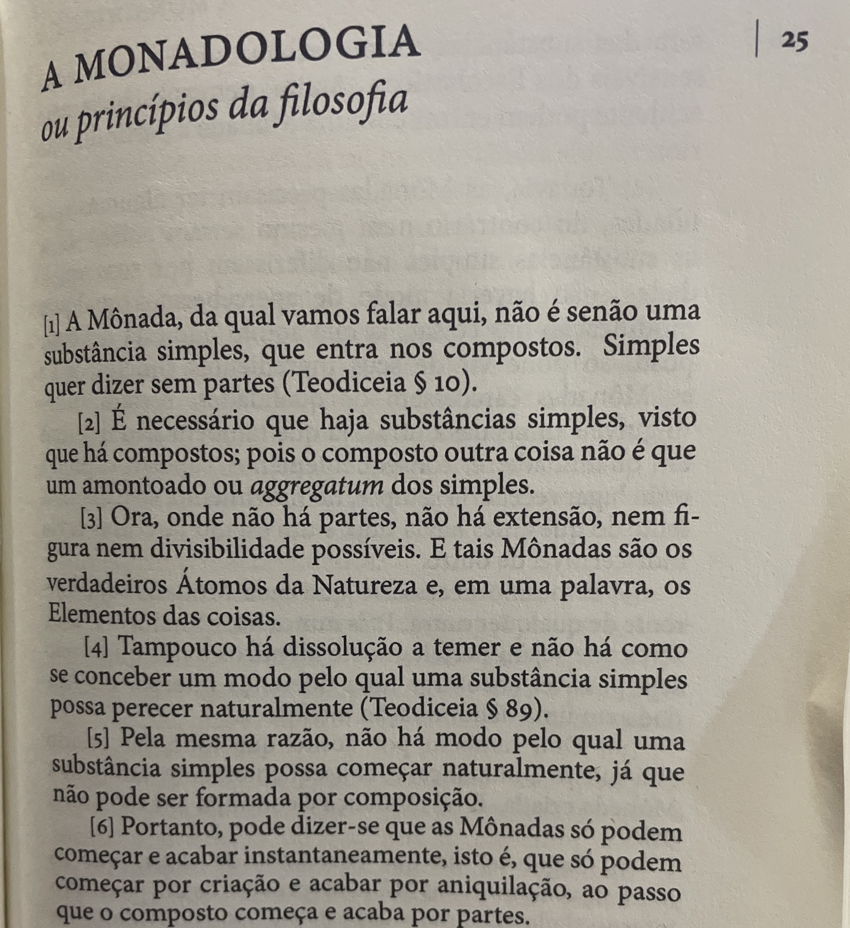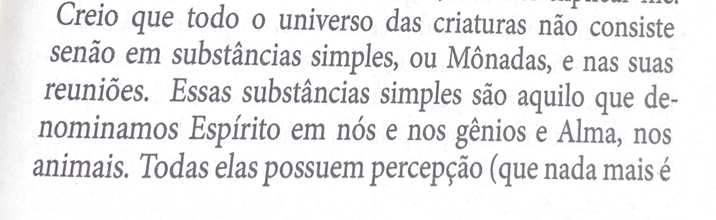 Vejamos algumas passagens desta obra, que aliás é uma coleção de textos, começando por “A Monadologia, ou princípios da filosofia“: