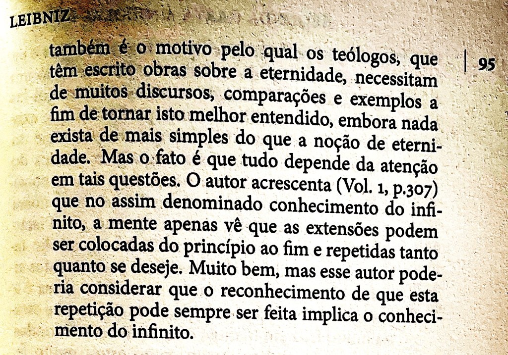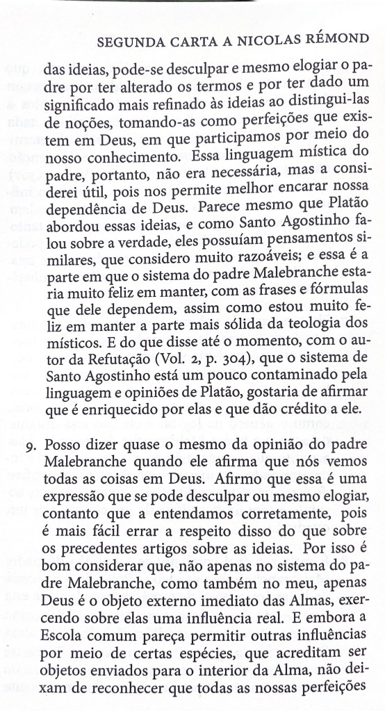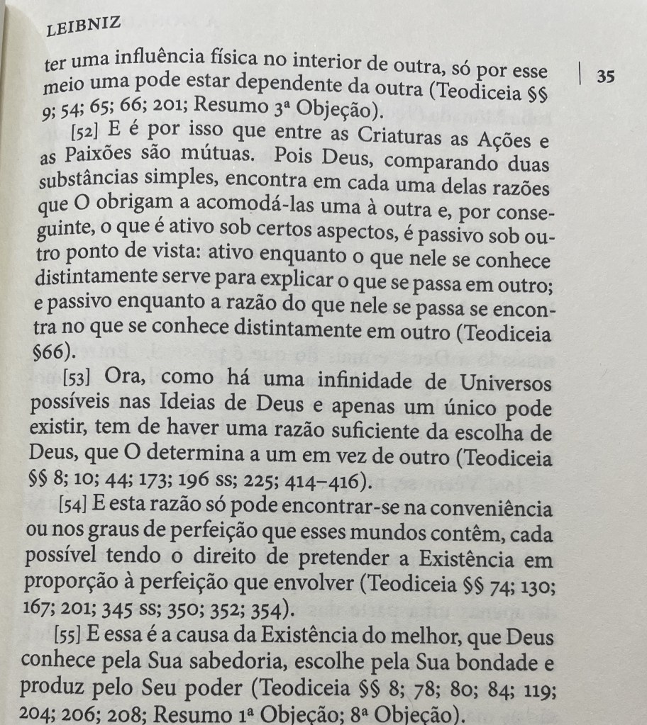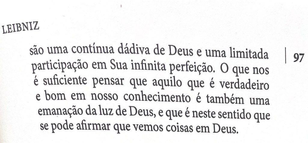 Comecemos por considerar que Leibniz não é infalível e nem perfeito. Não tem a teologia sagrada de um Apóstolo Paulo, e nem mesmo em sua filosofia pode ser completo o suficiente para nos fazer dispensar o estudo do platonismo, do aristotelismo, ou das luzes de Agostinho, Plotino, Tomás de Aquino ou Duns Scot, para citar apenas alguns.