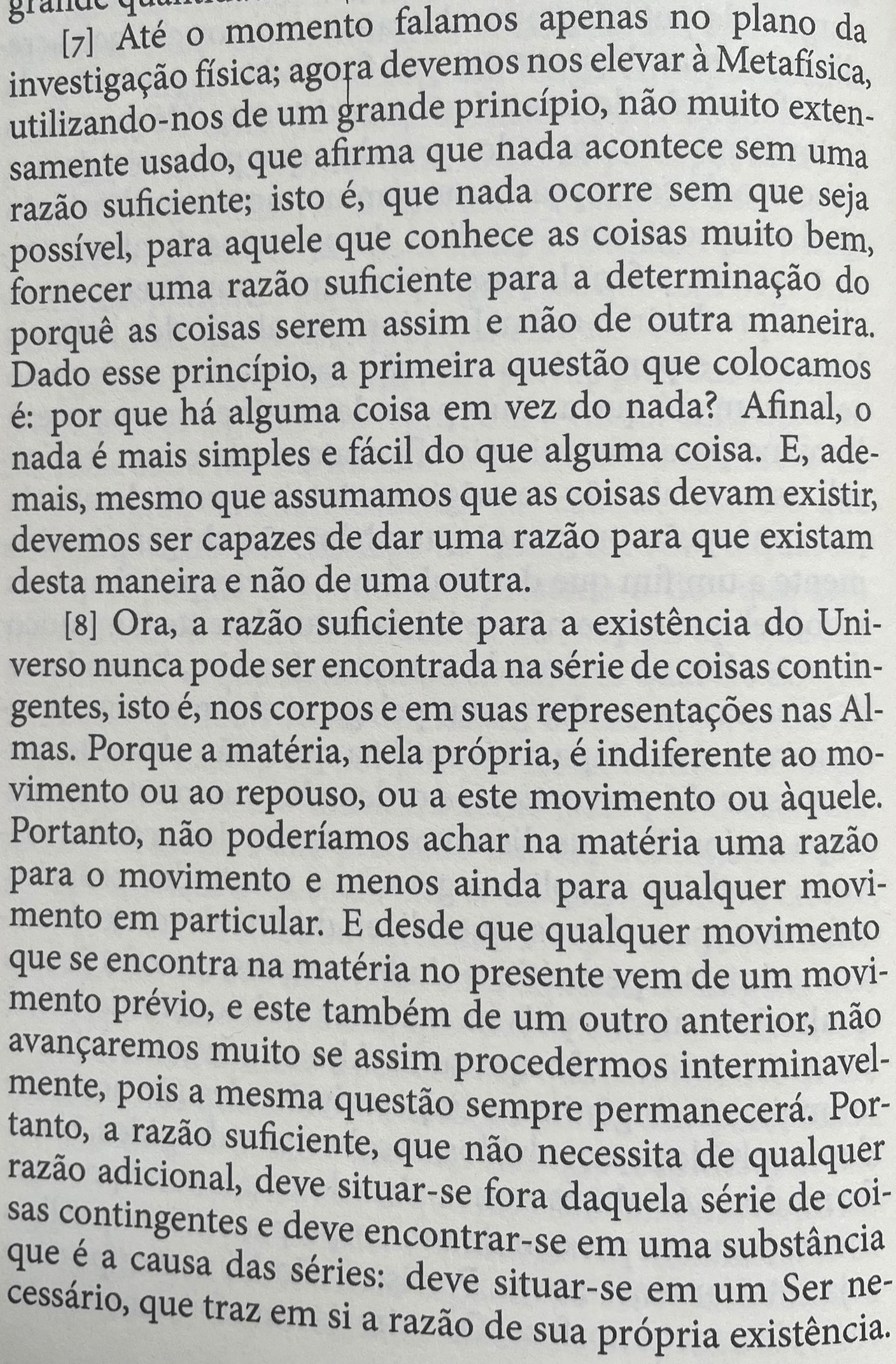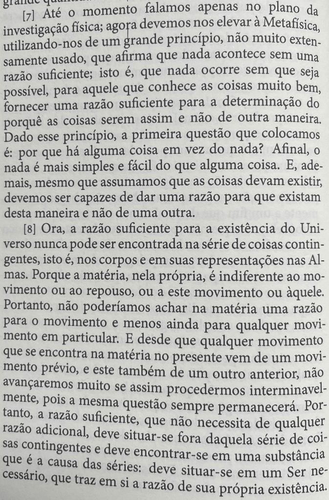 Aqui Leibniz expõe com muita clareza e elegância o Princípio da Razão Suficiente que requer o reconhecimento da substância divina, ou do Criador, para justificar o ser de todos os contingentes. Parece que todo filósofo de fato, ou amante da sabedoria de fato, vai sempre circular em torno da necessidade de Deus e de seu Amor, como aqueles serafins que cantam ao redor do Trono e proclamam a respeito de Deus que é “Santo, Santo, Santo“.
