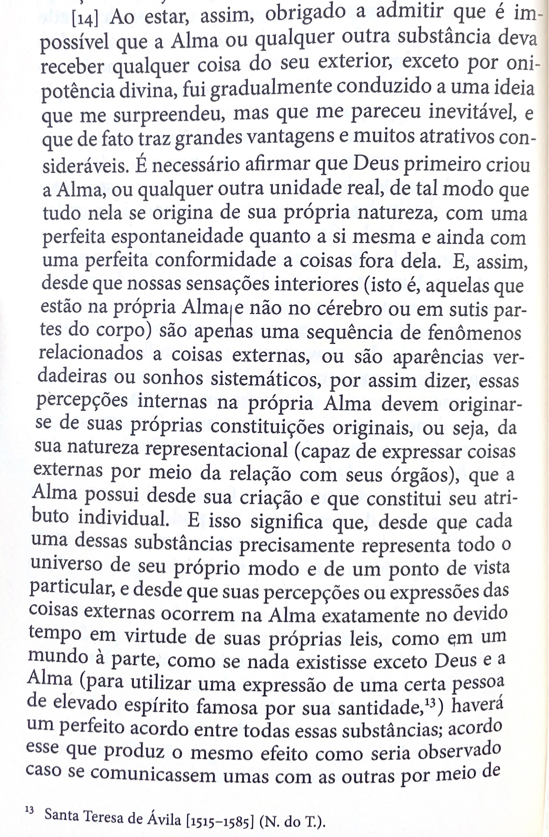 À primeira vista este raciocínio pode parecer inconveniente por uma ilusão de complexidade, mas bem entendido o princípio criativo de Deus, a razão leva ao contrário, isto é, à observação da conveniência do esquema proposto como o mais simples possível, pensando-se na preservação da integridade das substâncias, o que é uma preocupação constante para Leibniz. Igualmente, seu pensamento está em perfeito acordo com a noção de criação analógica, e sua concordância com a idéia do ordenamento divino chega ao ponto de que o autor não teme o reconhecimento da concordância com um nome como o de Teresa de Ávila. Este é um espírito realmente livre de preconceitos, buscando a verdade onde a puder encontrar.