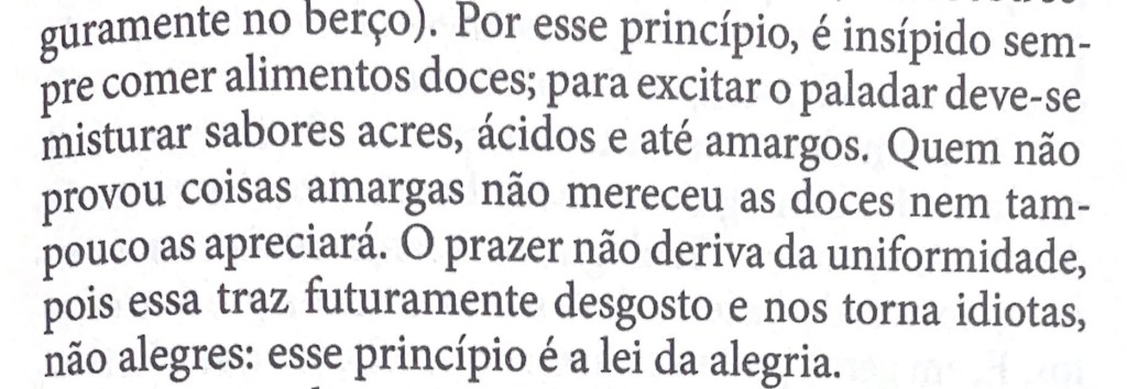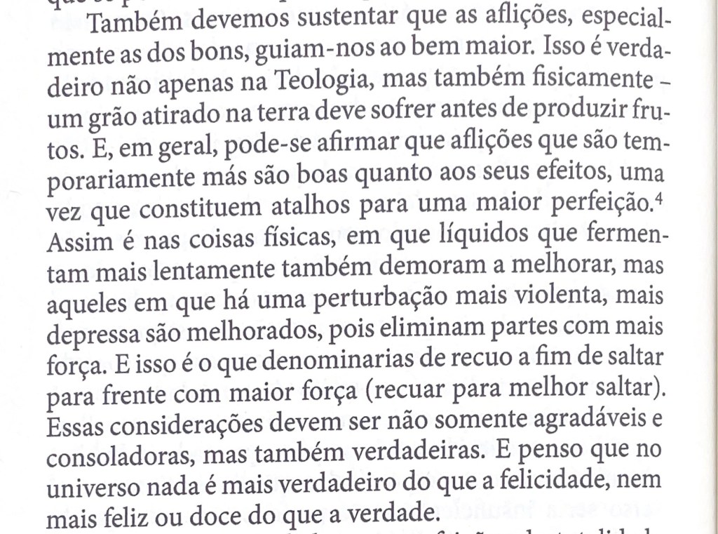 Aqui temos uma referência tênue à experiência do negativo para o proveito do positivo, embora isso não seja inequívoco. Penso que tratando-se de um filósofo ocupado com o rigor expressivo, a alternação não se refere a uma analogia entre bem e mal ou luz e trevas, mas entre diferenças num mesmo plano, ou entre espécies do mesmo gênero. Cabe-nos, generosamente, interpretar desta forma, embora ainda assim Leibniz seja limitado na sua visão teológica, como podemos constatar pelo que já pude expôr a respeito da garantia dos ânimos interiores por uma força espiritual concedida por Deus para a correção das subjetividades, de modo que o ser desgostoso e fadado a idiotice é este que ainda não tem aquela comunhão com o Espírito Santo que tornará toda e cada experiência única e perfeita na milésima vez, mesmo que em sequência direta, preservando a mesma qualidade como da primeira. E esta sim é a lei da alegria completa: o encontro da subjetividade plena com a objetividade perfeita, não restando hipótese que não seja ótima, e não sendo assim necessária a alternação dos estados e das circunstâncias, estando a alma mais livre do que nunca para escolher a sua próxima Percepção com total felicidade, e novamente a cada vez, para sempre.