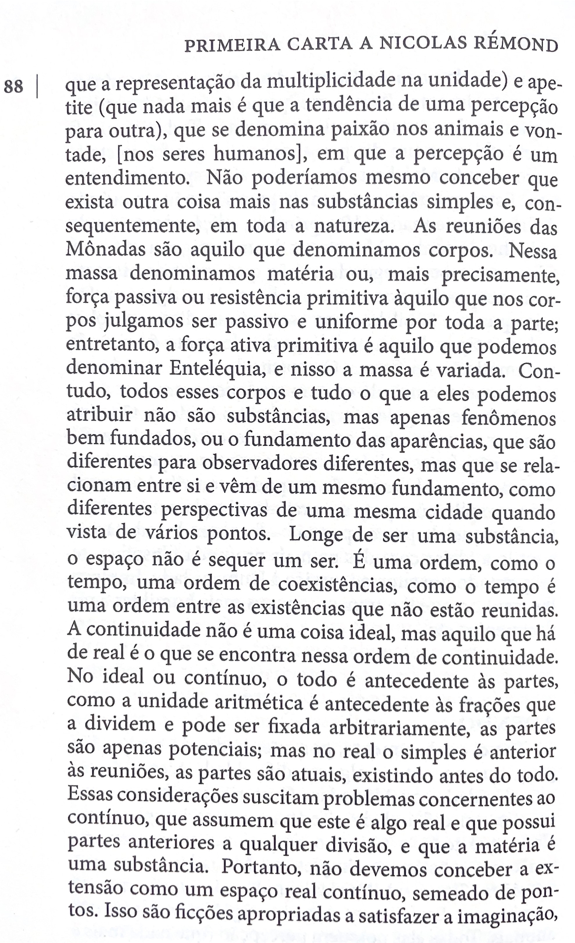 O que mais nos interessa aqui é o entendimento de que as realidades empíricas, inclusive o movimento dos corpos, são manifestações posteriores à substancialidade das mônadas, das quais toda multiplicidade experimentada subsiste apenas como manifestação para a realização da Percepção adequada a cada uma conforme o bem que corresponde ao objeto de sua Apetição.