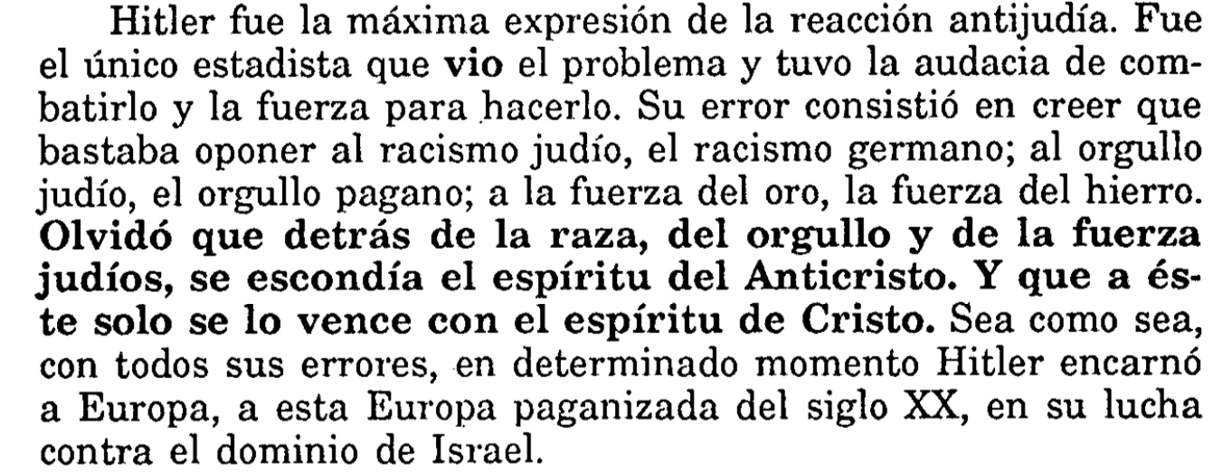 Hitler não estaria em melhores condições de vencer se tivesse feito uma cruzada cristã contra os bolcheviques, porque Deus não tem nenhuma satisfação com qualquer política deste mundo, senão com os indivíduos que ouvem o seu chamado de libertação. Ao contrário, providencialmente o governo do Anticristo é confirmado como consequência da desobediência que persiste e é mais perversa justamente do lado cristão da história. Que todos os demais queiram manter-se em estado de traição, é compreensível dada a sua ignorância, mas que os cristãos façam isso, eis o que mais justifica, moralmente, a vitória da conspiração anticristã.