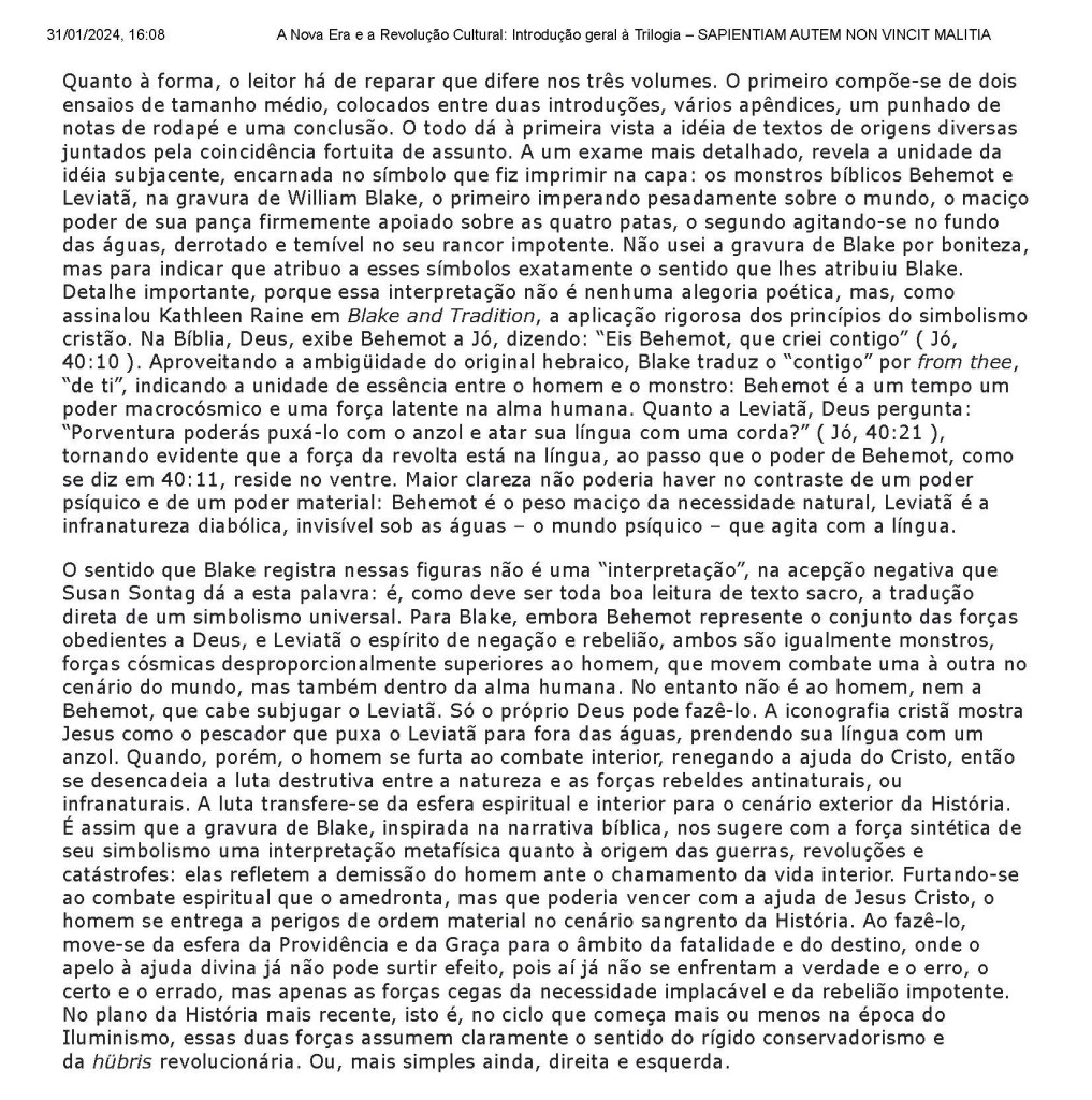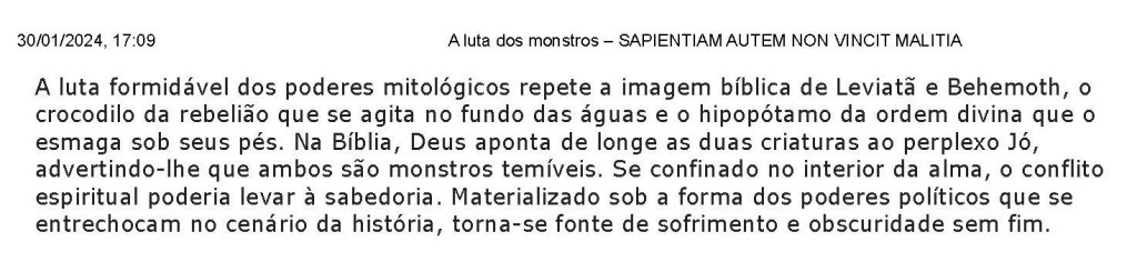 Não querendo ir muito a fundo agora, mas interessado não obstante em notar algumas particularidades da nossa cultura mais tradicionalista, conservadora e direitista, quero chamar a atenção para o uso que se faz daquelas figuras bíblicas monstruosas no Livro de Jó, o Behemoth e o Leviathan, dentro do discurso político contemporâneo, ao menos dentro de certo pensamento que pretende ser entendido de simbolismos e misticismos, ao estilo ocultista.