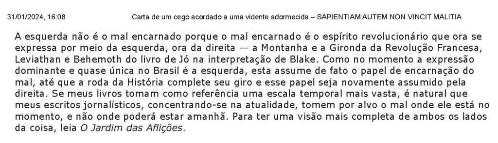 Olavo devia ter alguma intuição ou mesmo esclarecimento dessas coisas, quando chama a ambos de monstros e de “forças cegas”, aos quais opõe a vida interior na qual o ser humano poderia vencer “com a ajuda” de Jesus Cristo. Obviamente essa é uma diminuição iniciática da verdadeira salvação, já que a vitória contra o mal e a mentira é uma ação divina, e ao homem cabe apenas aceitar e receber a Graça da sua salvação. Mas pelo menos parecia haver até aqui uma certa possibilidade de superação da dialética dos monstros, ou, se quiserem, das alternativas políticas. De forma ambígua e obscura, é verdade, mas possível de qualquer modo.