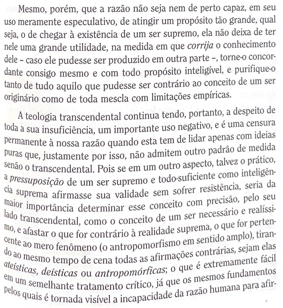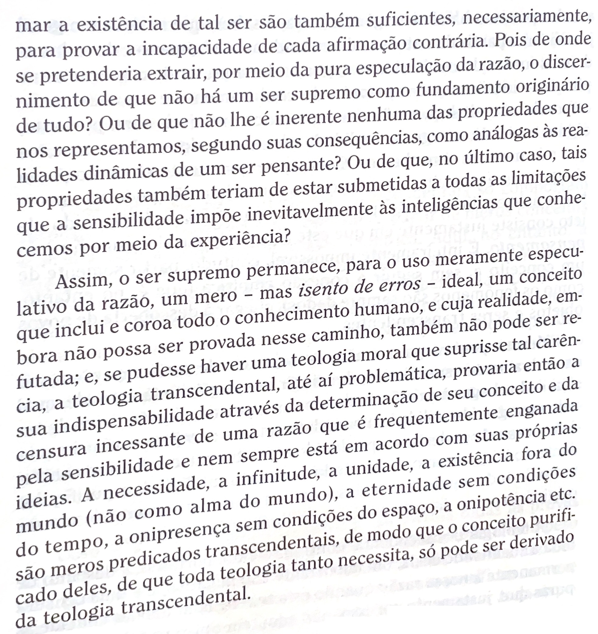 Nosso professor Kant está lidando aqui com a árdua tarefa de justificar o idealismo transcendental por analogia, defendendo a integridade do seu objeto (o “ser supremo”) sem o arbítrio de proposições dogmáticas, mas sem a negação das proposições que são necessárias como atributos do ideal puro.