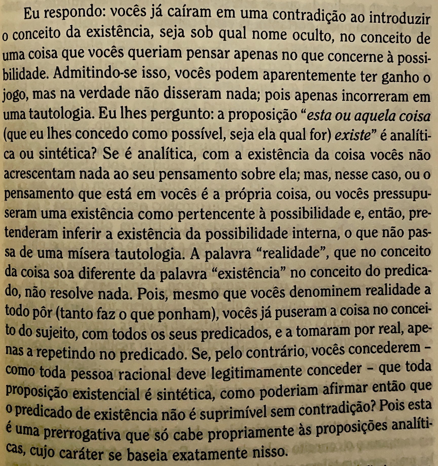 O conceito de Deus exige a sua necessidade, como objeto do entendimento da Razão (juízo analítico), de tal modo que a predicação de existência ao Ser divino sempre contraria a pureza daquela necessidade, já que essa qualidade só pode ser inferida ao contingente como intuição sensível (juízo sintético).