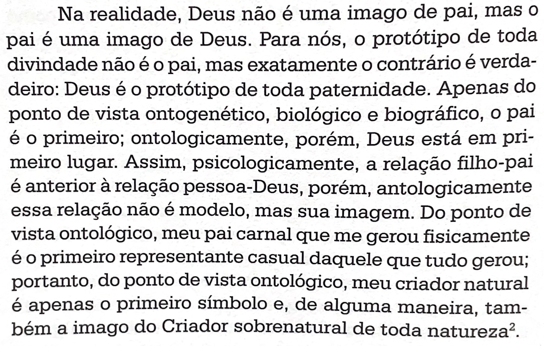 Não é surpreendente, e até mesmo assombroso, que Frankl possa corrigir a perspectiva comum da causalidade, e reconhecer a prioridade das causas fundamentais sobre as intermediárias? Nossos pais carnais não nos dão a idéia do Pai Celeste, mas antes Deus é quem nos provê pais carnais para que o conheçamos por analogia, esperando o maior em virtude do menor, etc. Como diz Jesus, por exemplo: “se até vos que sois maus sabei dar coisas boas aos vossos filhos…“. Isto é: tudo o que experimentamos como bondade das relações familiares é apenas uma amostra que aponta para a perfeição divina, que é o alvo máximo da vida humana.