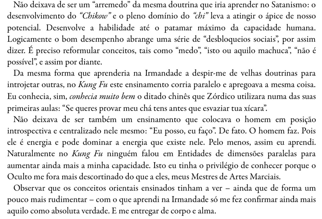 O que pode haver de comum, enfim, entre, por exemplo, espiritismo ou necromancia, artes marciais, festas orgiásticas, maçonarias, a divulgação de ídolos da música e do cinema, sacrifícios de sangue, esoterismos ou ocultismos em geral, meditação transcendental, uso de drogas alucinógenas, yoga, bruxaria, o culto da democracia, pactos entre mafiosos, doutrinas gnósticas, rituais religiosos e organizações especializadas em chantagem?