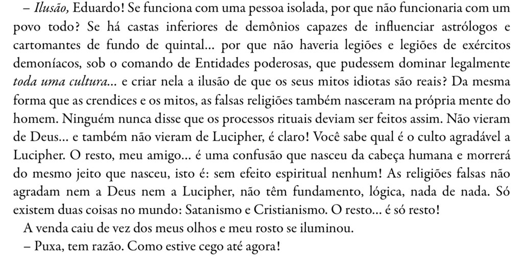 E o pior de tudo –e aqui começamos a identificar um provável caminhar de Mastral em direção ao testemunho do espírito de Ingenuidade–, que vantagem temos na denúncia contra o Satanismo, se esta apenas nos joga nos braços do Cristianismo?