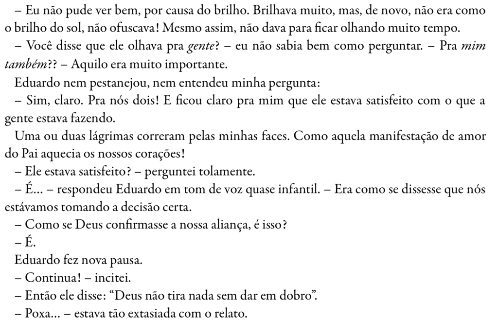 O patético da ilusão da salvação mútua do casal fica evidente pela linguagem empregada. “Como se Deus confirmasse a nossa aliança“. A que ponto chegamos? Quer dizer que o Altíssimo sobre todas as coisas moveria seus anjos para aparecerem para a confirmação da aliança entre esses dois filhos de Adão e Eva, para que eles apenas repetissem exatamente a mesma coisa, e como se não houvesse nada mais importante, como qualquer dom espiritual a respeito da Salvação? Isso é o cúmulo da Ingenuidade, já virou estupidez e total ignorância, e até mesmo narcisismo. É um gesto desesperado das duas partes do casal, como se fossem salvar um ao outro, e desejando que Deus fosse o fiador dessa insanidade.