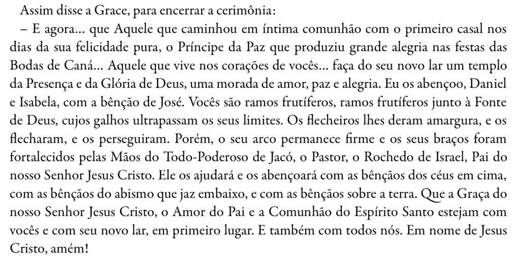 No puro espírito de usurpação, Grace então diz “eu os abençoo“, como se isso estivesse em seu poder, exatamente na imitação de Jacó em suas bênçãos, que é o modelo da sua manifestação. Não temos problemas com Jacó, porque não podemos cobrar um personagem milenar pela linguagem traduzida aos nossos dias. Mas podemos cobrar os tradutores de hoje por, no mínimo, mal gosto, se não por algo pior.