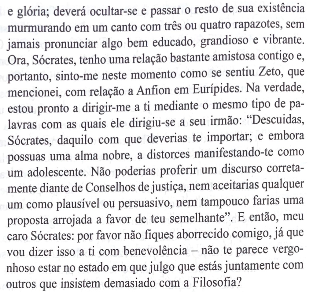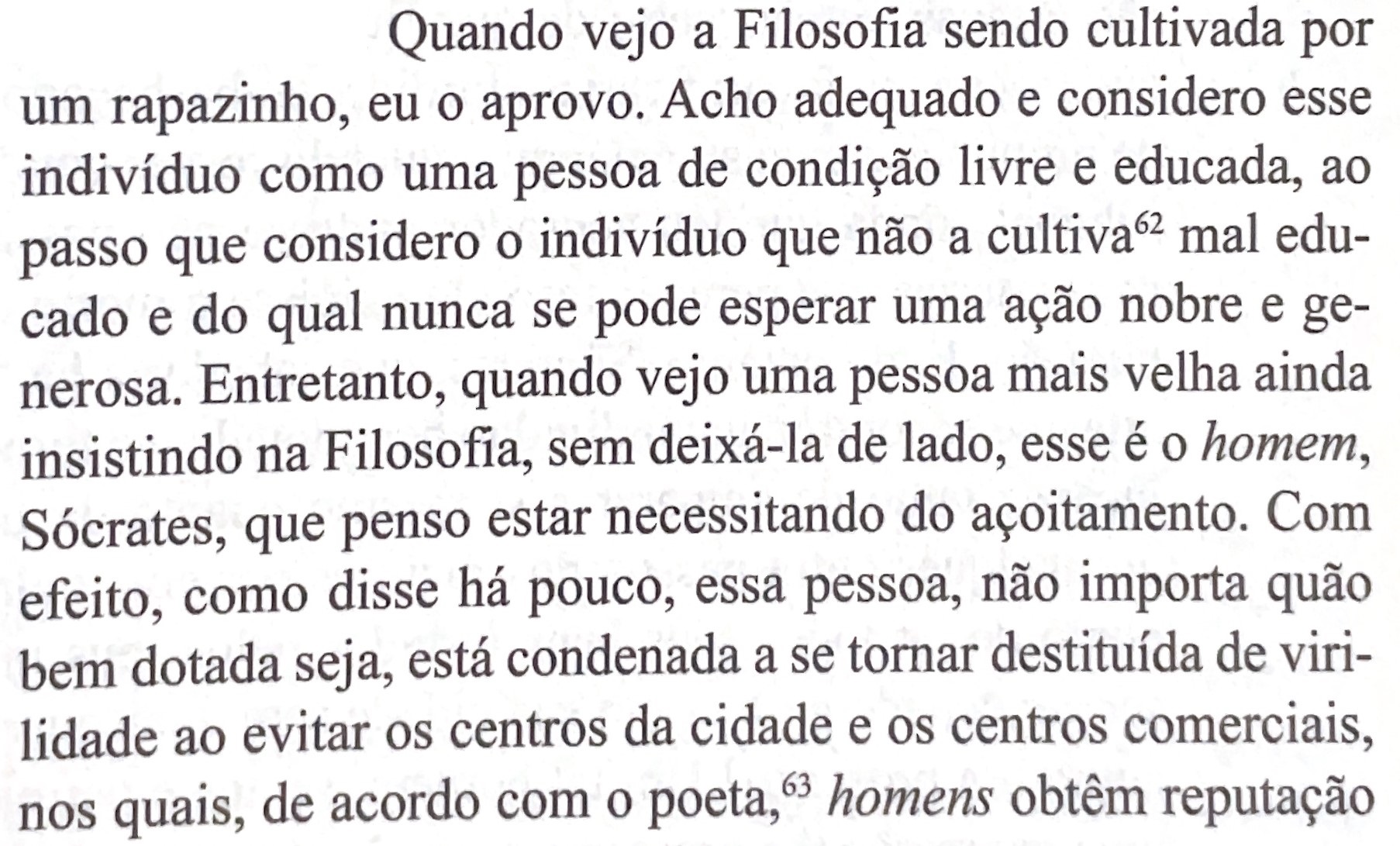 O adulto, porém, que continua nutrindo esses interesses que deveriam ser passageiros e temporários, é chamado no mínimo de tolo, isso quando não for um corruptor da juventude, exatamente como Sócrates será qualificado pelos seus acusadores mais tarde no processo que o levou à morte.