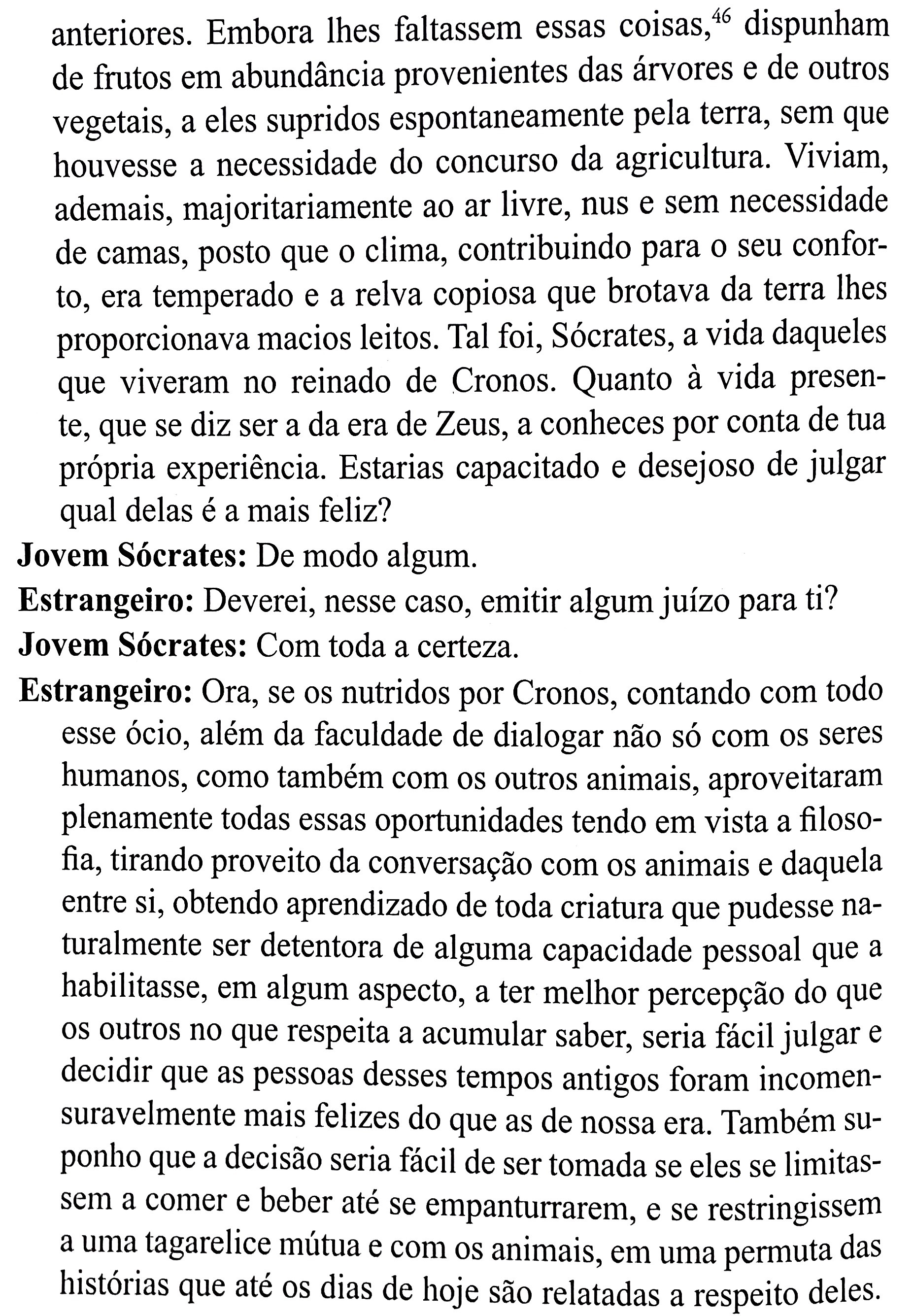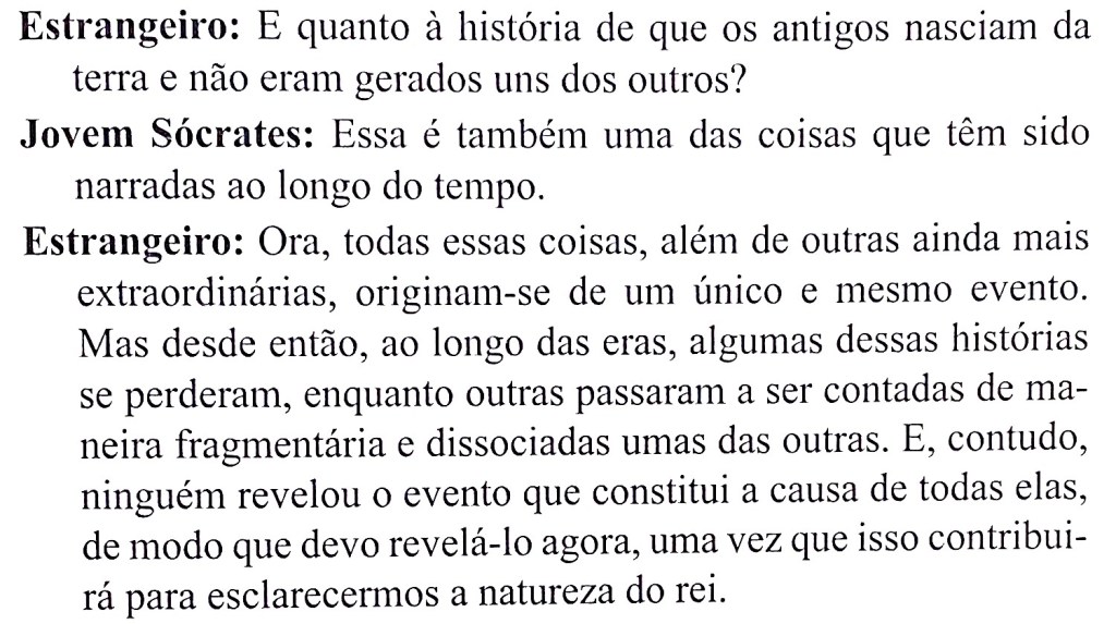 Eventualmente o Político de Platão escapa desse exercício lógico de categorização e entra na mais substancial parte da discussão de uma metafísica que explique a condição humana. Antes de entrarmos na especificidade desses mitos, porém, convém-nos observar uma referência interessante sobre uma era anterior à do reinado de Zeus, aquela do período tido como áureo, de seu pai Cronos: