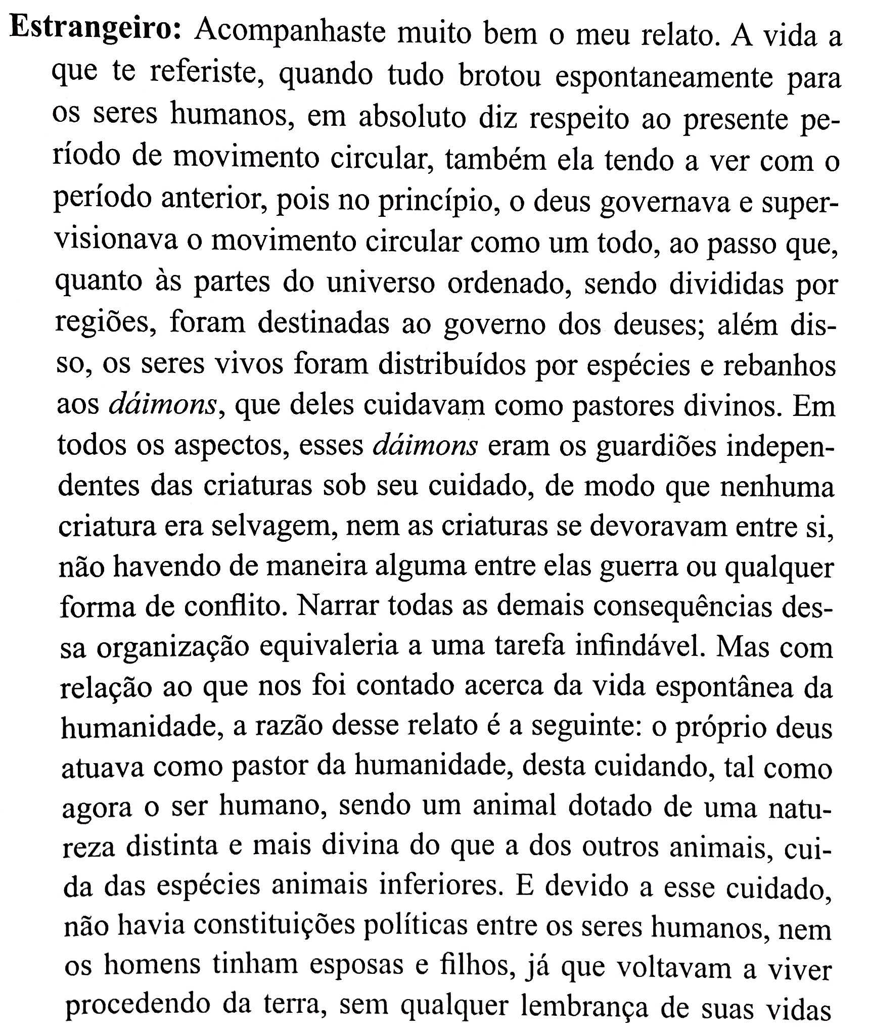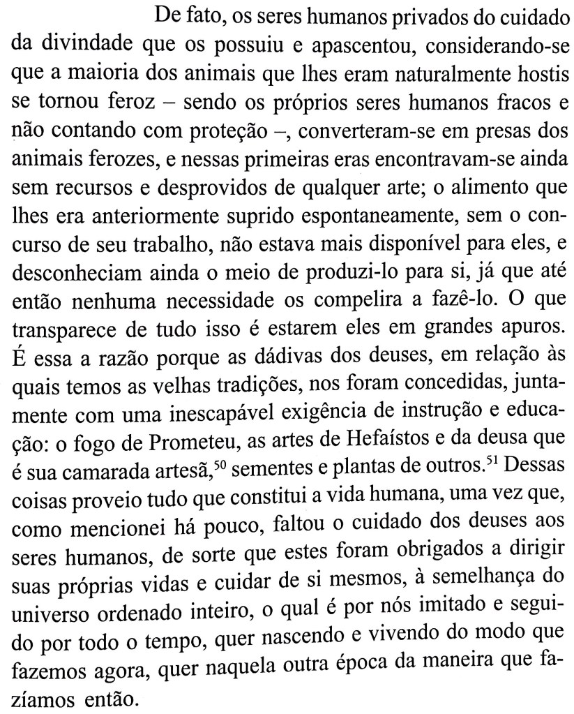 A afirmação de que “faltou o cuidado dos deuses aos seres humanos” é tão gnóstica quanto esta outra que diz que “estes foram obrigados a dirigir suas próprias vidas e cuidar de si mesmos”. Quem foi que disse que o perecimento de uma raça perversa não seria um tipo de cuidado, e talvez o único restante de uma série de opções, para ver se esse ser finalmente se arrepende de sua Pretensão? E como alguém pode se arrepender de um mal se não experimentar as consequências de sua escolha? Como seria justo o governo divino que, poupando a injustiça, impedisse os governados de entender o sentido de sua escolha? Platão não se coloca essas possibilidades.
