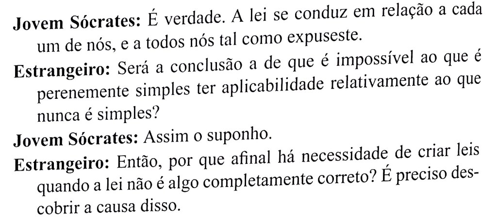 Já em outra parte muito valiosa, será enfatizada a transcendência da singularidade com relação à formalidade das Leis. Há necessidade de uma legislação que seja a mesma para toda uma coletividade, contando que por regra tenda a trazer maior benefício à maioria, mas sem que constitua uma perfeição que teria que abarcar indefinidamente a particularidade do singular, o que seria impossível por definição. Isto é excelente. Mostra a precariedade da autocracia dos governos humanos. Assim como a Lei Natural não determina o que é o Justo e o que é o Verdadeiro, também não o faz a Lei dos Homens. A Verdade e a Justiça transcendem infinitamente a Natureza e o Homem. Platão o reconhece: