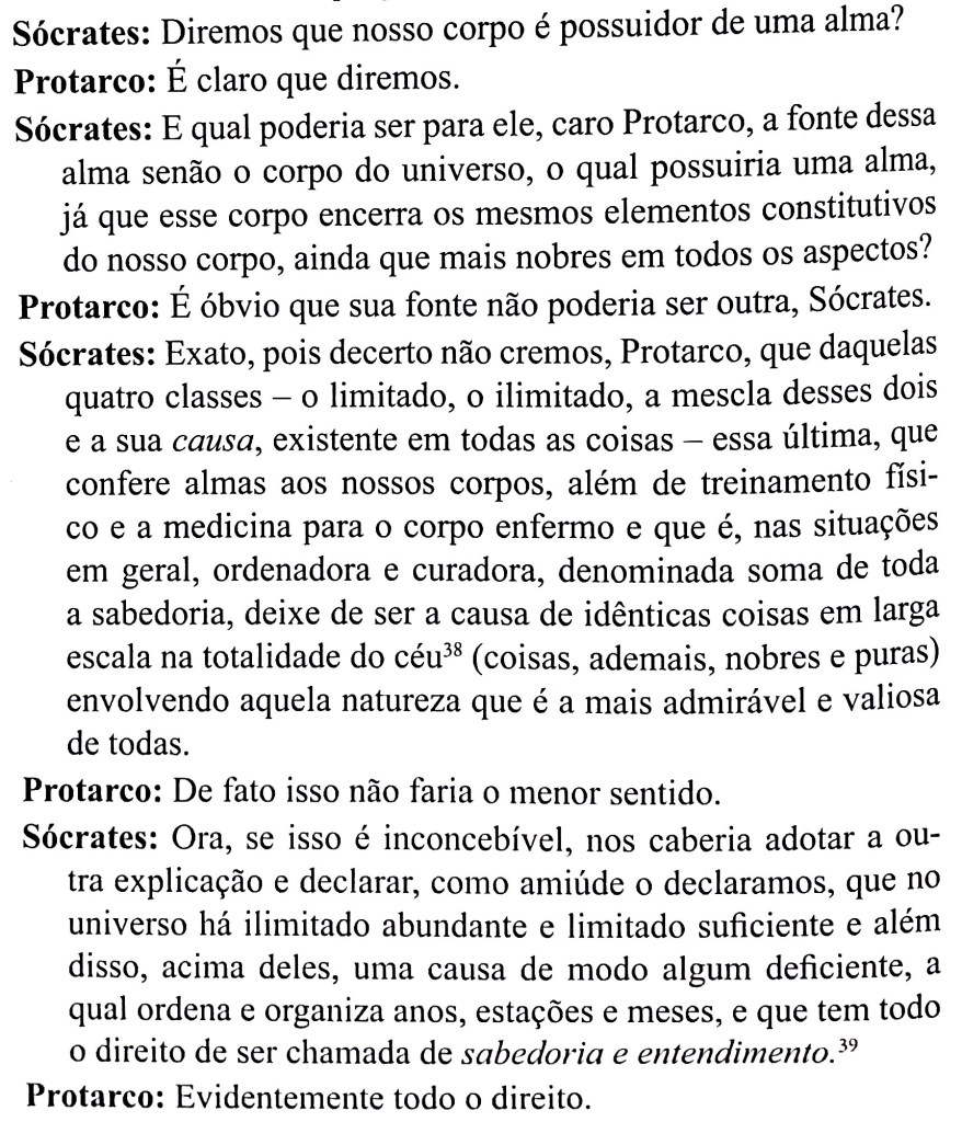 Nota-se como a cosmologia platônica interfere na sua ontologia, e como isso complicará o entendimento do que significa o prazer. O dualismo das substâncias corporal e psíquica, sendo uma produção da própria psique, jamais reconheceria a qualidade não abstrativa do Intelecto acima da Razão. Comparado com os animais, dentro de um sistema fechado (entrópico, imanentista, sem Deus), o ser humano só pode vencer se exaltar a sua própria racionalidade. Mas quando toma por real não somente a sua experiência da Percepção, mas a substância do que é percebido em si mesmo, o ser humano já transforma a sua exaltação em idolatria, seja da Natureza ou do próprio Homem. Bastaria voltar ao elemento básico da sua experiência, que é a Percepção, bem como à necessidade de uma causa suprema externa e transcendente à essa Percepção, que tudo se corrigiria rapidamente. O idealismo da filosofia platônica está no meio do caminho entre essas duas possibilidades. Como de costume, Platão mistura erros com acertos: desintegra a unidade do Intelecto atribuindo substância ao que não convém, mas reconhece a fonte divina, transcendente, do Ser.