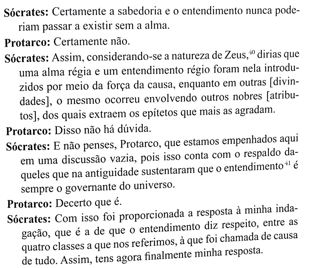 Sem uma definição boa do prazer é evidente que a sabedoria parecerá superior com facilidade. Sócrates logo ataca a noção superficial de prazer mostrando a possibilidade de prazeres bons e maus. O que ele se esquece de fazer é a pergunta sobre saberes bons e maus. Não digo nem da falsa opinião, que é um tema habitual dos diálogos platônicos, mas de conhecimentos que só produzem o mal. Ou não existe uma sabedoria da produção de armas de terror, ou da arte da tortura, ou da mentira, ou da tirania, etc.? Sócrates poderia responder que nenhuma dessas ciências constitui a verdadeira sabedoria, porque a verdadeira sabedoria só pode produzir um bem. Ao que seria fácil contrapor que igualmente os prazeres maus não constituem o verdadeiro prazer. E Filebo e Sócrates estariam quites, isso ainda que a sabedoria fosse considerada a juíza da distinção do que é e do que não é bom. Porque ela poderia ser apenas um meio para a finalidade do prazer, como a arte da produção de navios ou a arte da navegação são subordinadas ao objetivo de se alcançar um destino. O destino é a causa final.