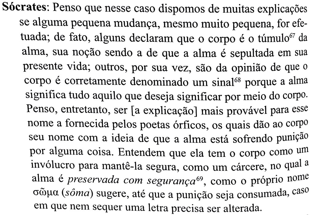 Digo útil porque Platão afirma categoricamente que entende por mais correta a designação dada pelos poetas órficos, uma influência marcadamente gnóstica assumida pelo filósofo. Claro que o nosso objetivo não é o de julgar, mas de entender. No panorama de Platão, essa determinada influência exerceu um peso considerável. E o corpo de certo modo possui mesmo algo disso tudo que é afirmado: é o “túmulo da alma”, desde que é por ele que experimentamos a nossa fragilidade e a nossa mortalidade como falta da posse do dom da vida; é um “sinal da alma” porque opera como o objeto mais imediato da Percepção (na minha própria definição, o corpo é a interface persistente da Percepção); e é também um sistema de segurança, como um “invólucro” que limita a ação da alma para a sua proteção, como se faz com animais usando-se cercas, ou com crianças pequenas, etc. Neste último caso, preferido por Platão por influência dos órficos, só devemos ter o cuidado de diferenciar este corpo presente (que podemos chamar de “Corpo de Queda”) de outros possíveis onde o limite é mais adequado à todas as potências da alma, como o Corpo de Graça, e principalmente o Corpo de Glória. Ou seja, o limite não é um mal, mas exatamente um contrário disso, agora um restritor do mal, e então finalmente um meio para a realização de todo o nosso bem possível.