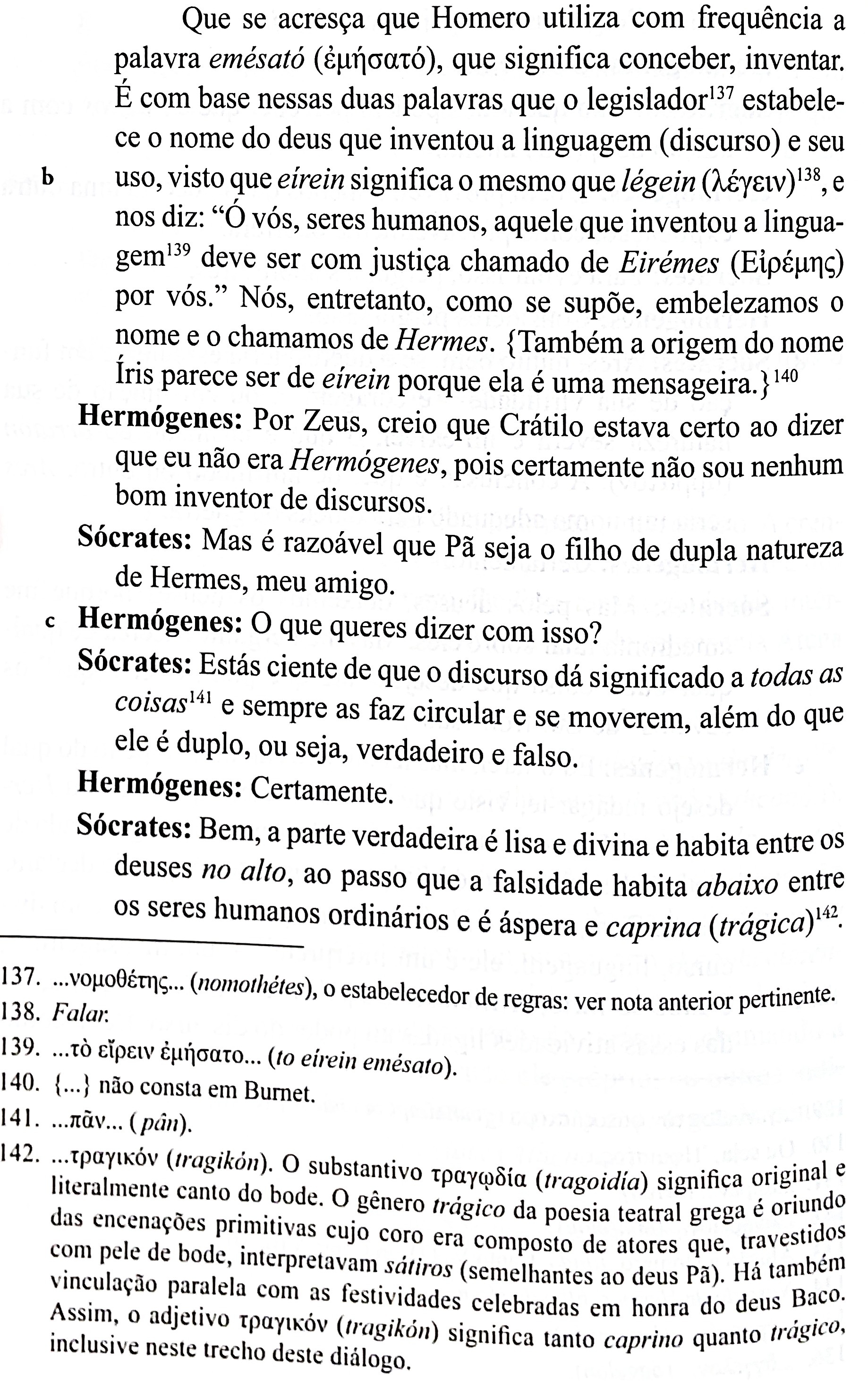 Daí em diante o filósofo aceita que suas conjecturas são especulações sobre opiniões tidas como corretas à partir do costume, e não propriamente produto de uma ciência. Chega a afirmar que Plutão (Hades) é um deus filósofo, etc. Em determinado momento o discurso fala sobre Hermes e Pã, e faz uma afirmação curiosa sobre o gênero trágico, que expõe a hipótese da intenção primordial da cultura como a legitimação da Mistura:
