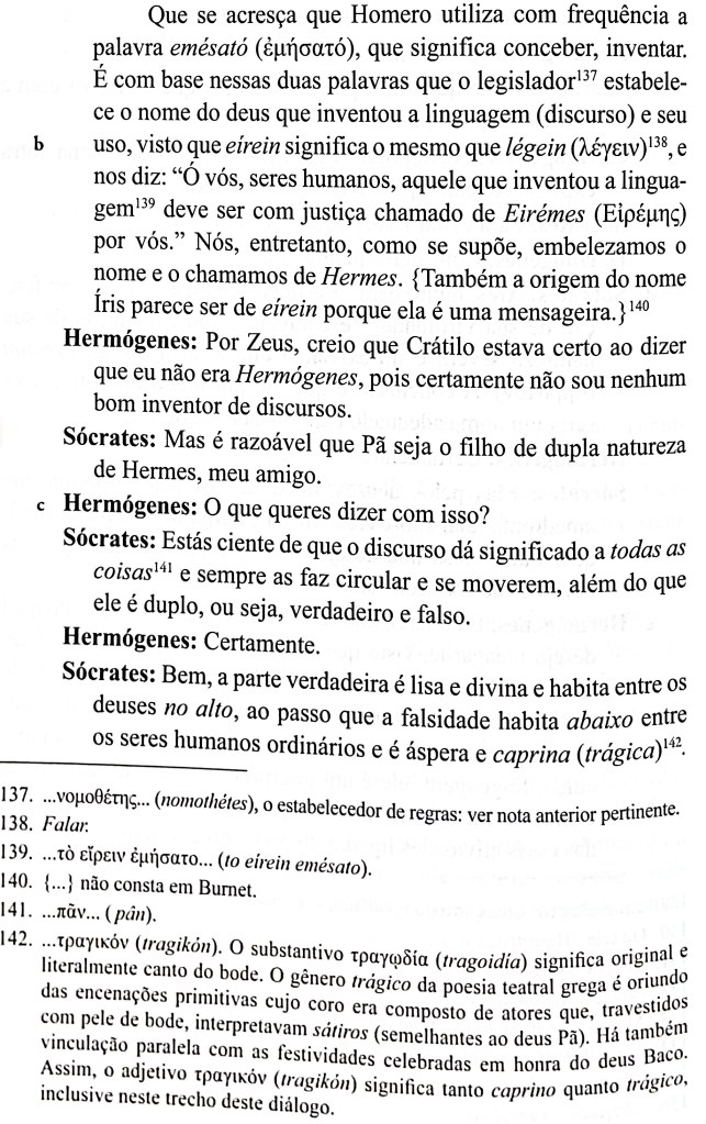Prosseguindo na sua investigação, o filósofo tentará defender essa capacidade nominalista humana, ao menos da parte de uns poucos capazes, o que o faz explorar as etimologias como artes de definição, com resultados variados. Fala de discursos literários como os de Hesíodo e Homero, e analisa nomes dados a deuses, heróis, etc. Ao tratar do sentido do nome do corpo (soma), encontramos uma reflexão que pode nos ser útil citar:
