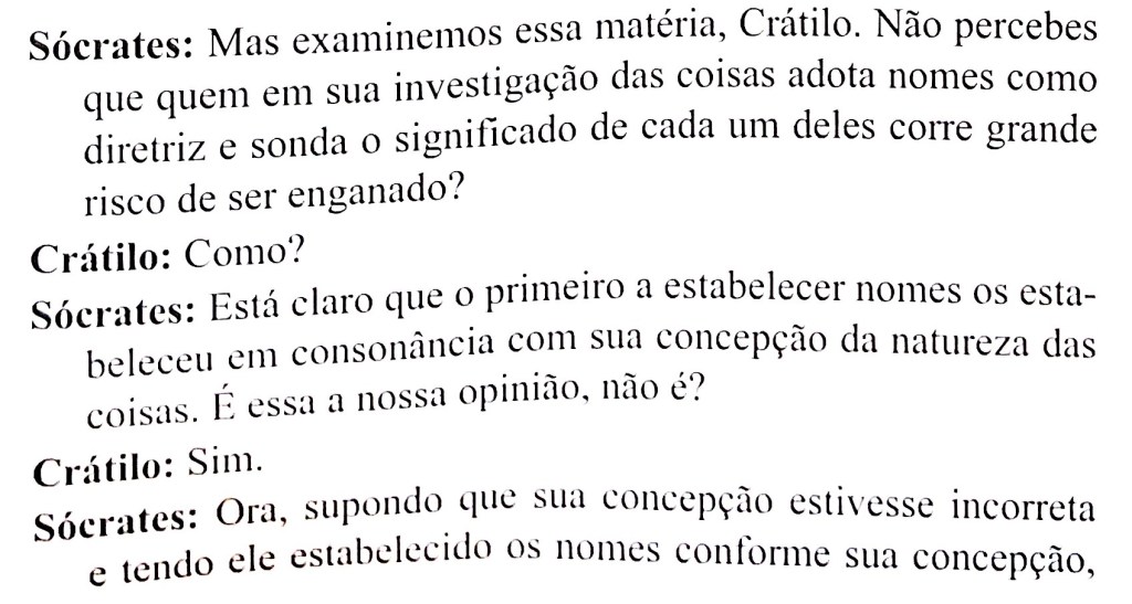 Mais adiante pareceria que o filósofo faria apenas uma reflexão sobre considerações gramaticais e morfológicas, mas Platão nunca perde de vista o quadro maior, e a certa altura alcança um excelente panorama crítico no Crátilo, quando aponta para o risco tanto das investigações baseadas em nomes antes das coisas quanto da confiança na Tradição e no costume, fazendo deste diálogo um testemunho poderoso não só da Humildade, como também da Vigilância, o que é incomum na obra platônica: