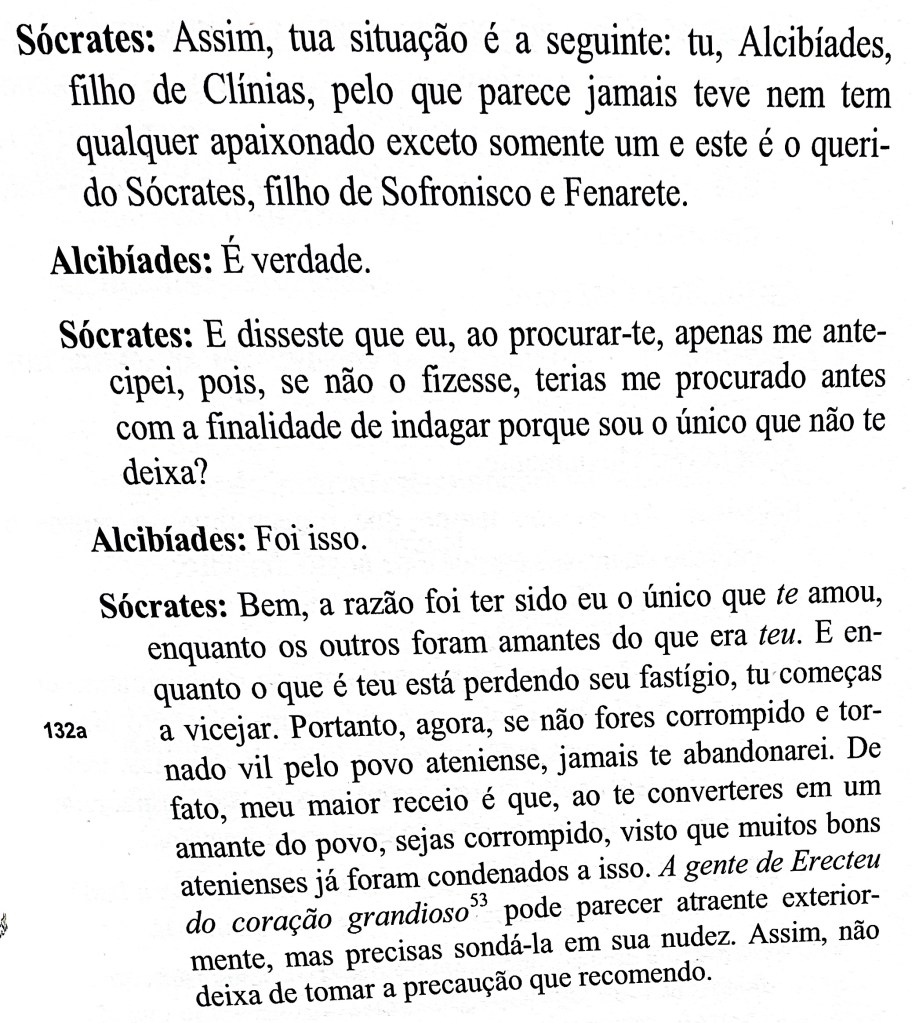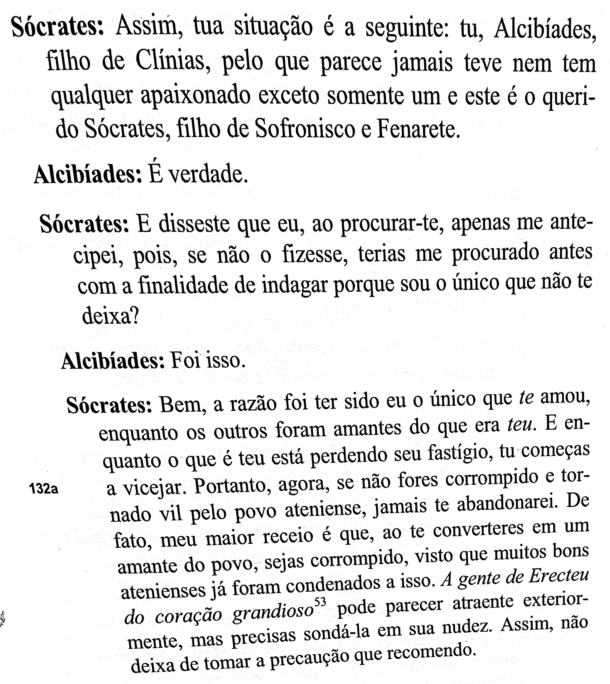 Sócrates tenta resgatar o jovem de suas ilusões consigo próprio e com o mundo: não, você não vai se tornar bem-sucedido politicamente, pois não conhece bem as coisas públicas, e nem sequer conhece bem a si próprio, especialmente sua própria ignorância. É por isso que o filósofo é um amante verdadeiro: ele não quer usar Alcibíades para quaisquer propósitos seus, às expensas da ruína do jovem, mas quer que este realmente prospere na vida, o que porém requer antes de mais nada essa grande humilhação de colocar Alcibíades no seu devido lugar.