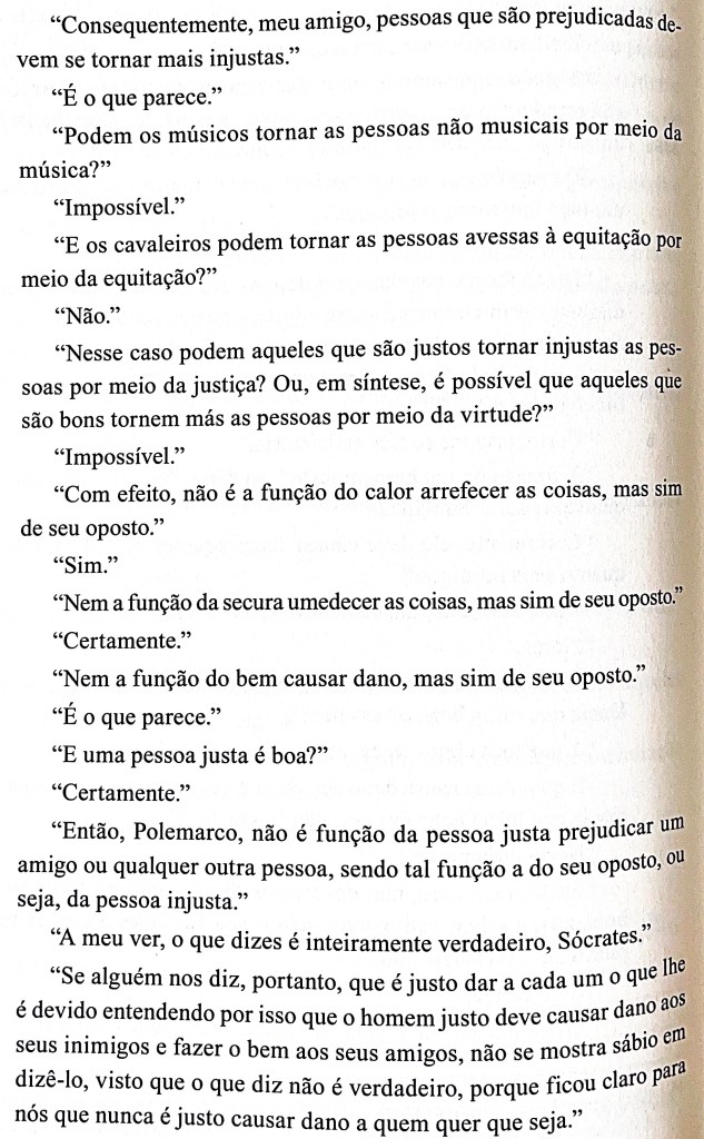 Trasímaco, o primeiro debatedor de Sócrates, proporá que a Justiça é a vantagem do mais forte, isto é, aquilo que é determinado pela vontade de quem detém o poder, a favor de seus interesses. Mas ele é forçado, pelo diálogo, a reconhecer que o objeto de qualquer arte, inclusive a de governar, está fora de si mesma, e se o objeto do governo das coisas públicas é o benefício dos governados, então a sua definição de Justiça está totalmente invertida: a Justiça é a vantagem do mais fraco. Novamente, aqui, ouvimos o eco do Evangelho: o maior será quem mais servir, e quem se humilhar será exaltado (Jesus).