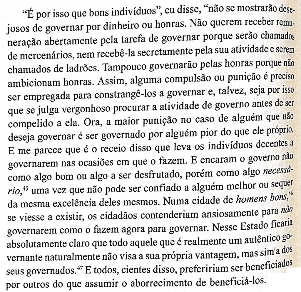 Em linha com o que é a sua filosofia idealista, Platão defenderá que o objeto da política é uma Justiça tão boa que num Estado formado por bons cidadãos o governo teria que ser forçado aos melhores, já que estes, se não fossem constrangidos a isso, prefeririam cuidar de seus próprios interesses privados. Vejamos o argumento: