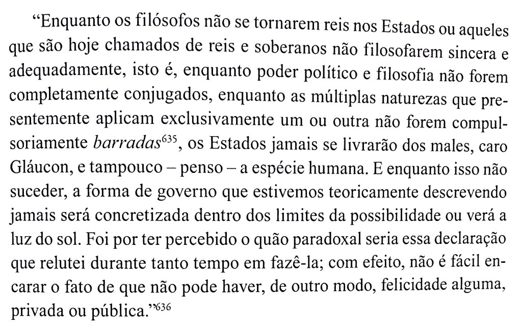 Mas maior mudança não há do que a discussão daquele modelo político criado apenas com a função da descoberta da essência da Justiça, mas agora em termos de exequibilidade. Gláucon poderia ter esse desejo equivocado corrigido por Sócrates, mas Platão precisa anunciar toda a sua Pretensão de uma vez por todas: