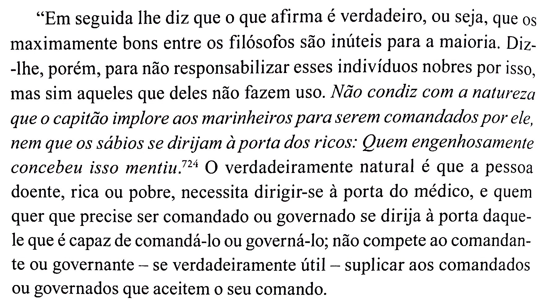 No Livro Sexto, Adimanto questiona Sócrates à respeito da idéia do Rei-Filósofo, propondo a opinião comum de que os filósofos são geralmente tidos como inúteis, isso quando não são considerados prejudiciais. A resposta merece ser citada:
