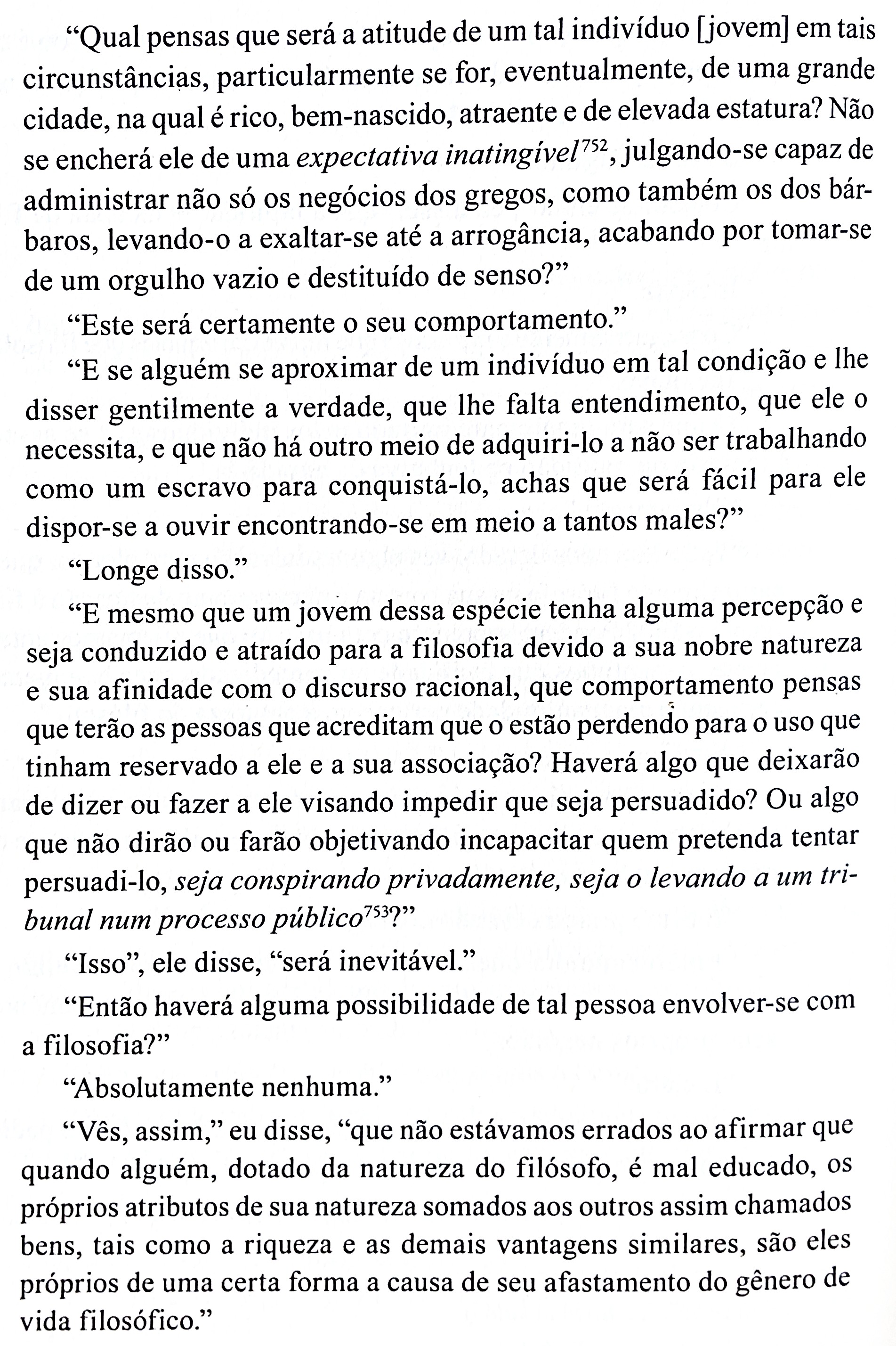 Adiante, Platão defenderá que é impossível à multidão que pratique a Filosofia. E mais, não só a maioria é incapaz de filosofar, como é incapaz de reconhecer o verdadeiro filósofo. E uma má educação, voltada aos interesses dessa maioria, como num sistema democrático cuja cultura é de uma demagogia populista, é capaz de corromper até a pessoa mais bem destinada, seja por dons ou circunstâncias, à Filosofia: