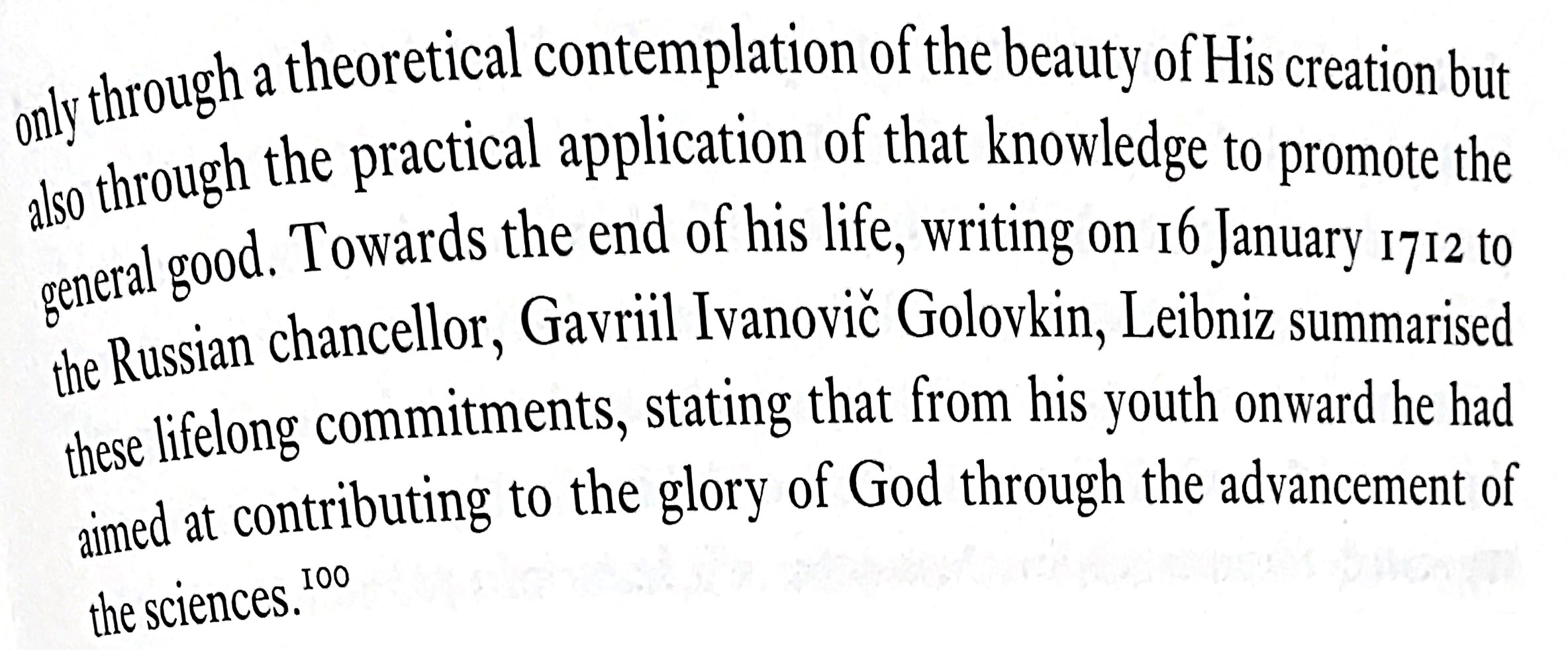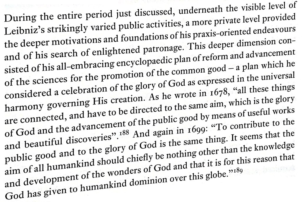 Tradução livre: “Durante todo este período, debaixo do nível visível e impressionante das várias atividades públicas de Leibniz, um nível mais privado provia as motivações profundas de seus projetos orientados para a prática, e de sua busca por um patronato esclarecido. Essa dimensão mais profunda consistia de seu plano enciclopédico de máxima abrangência de reforma e avanço das ciências para a promoção do bem comum –o plano que ele considerava ser a celebração da glória de Deus como expressa na harmonia universal que governa a Sua criação. Como ele escreveu em 1678, ‘todas essas coisas estão conectadas e devem ser dirigidas ao mesmo objetivo, que é a glória de Deus e o avanço do bem comum através de criações úteis e belas descobertas’. E de novo em 1699: ‘Contribuir para o bem comum e para a glória de Deus é a mesma coisa. Parece que o objetivo de toda a humanidade deveria ser acima de tudo nada além do conhecimento e desenvolvimento das maravilhas de Deus, e foi por isso que Deus deu à humanidade o domínio sobre este globo.”