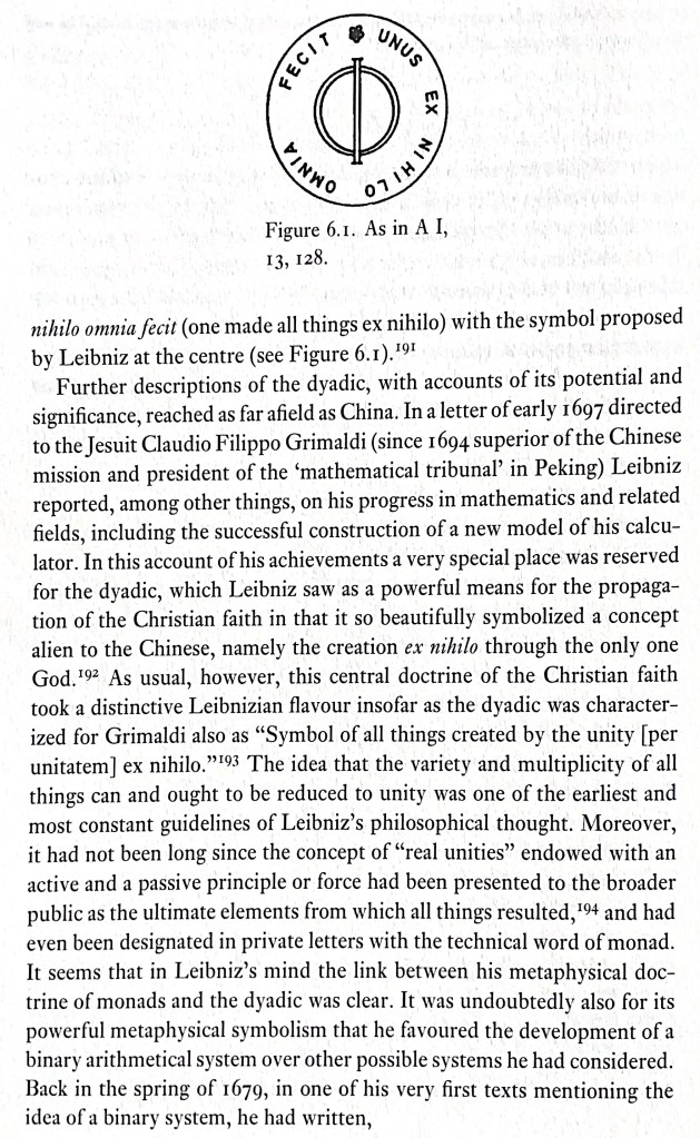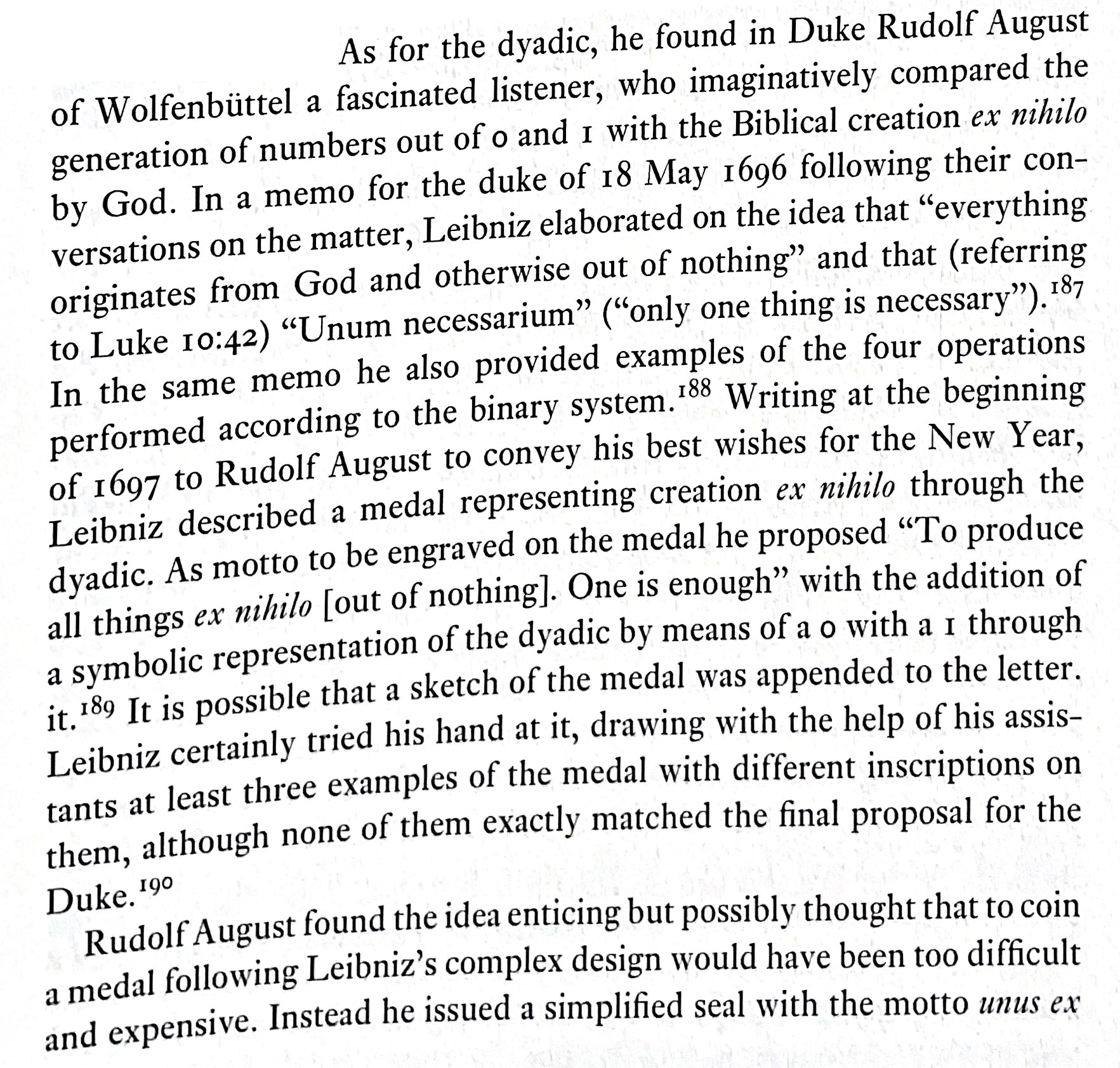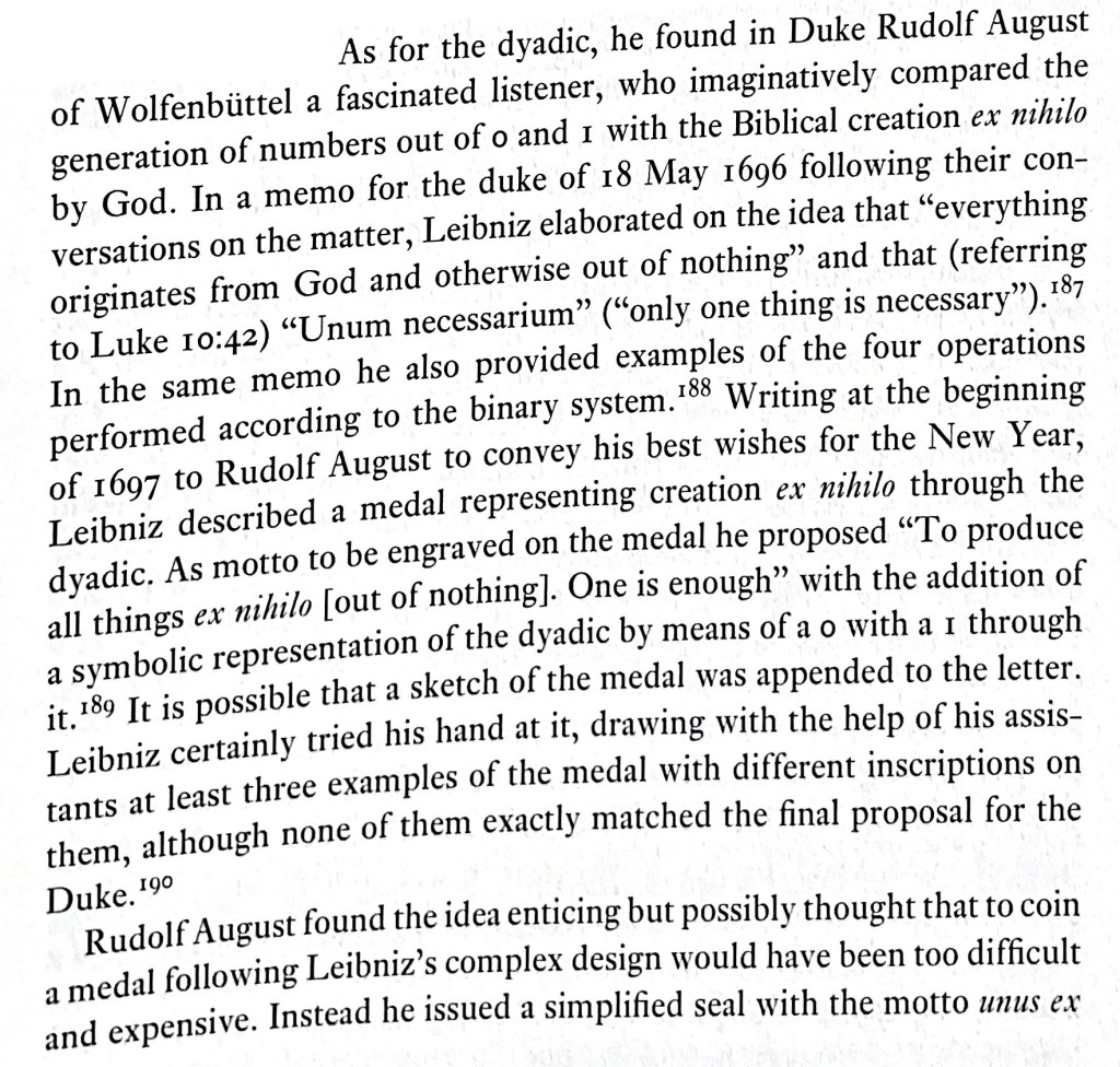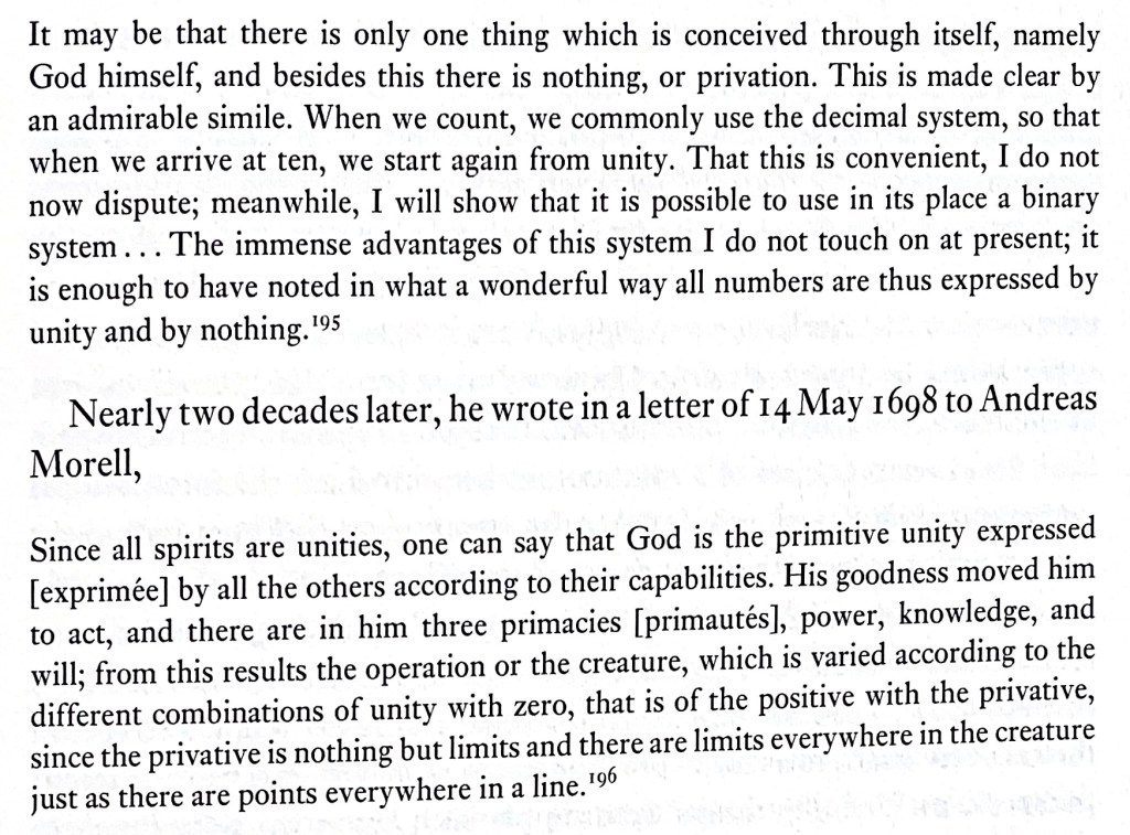 “Pode bem ser que uma única coisa é concebida através de si mesma, nomeadamente o próprio Deus, ao lado da qual não há nada, ou a privação. Isto é esclarecido por um admirável símile. Quanto contamos, nós geralmente usamos o sistema decimal, de modo que quando chegamos a dez, nós reiniciamos à partir da unidade. Que isso é conveniente, eu não disputo agora; enquanto isso, eu vou mostrar que é possível usar em seu lugar um sistema binário… Não tocarei agora nas imensas vantagens desse sistema; é o suficiente notar de que modo maravilhoso todos os números são expressos assim através da unidade e do nada.”