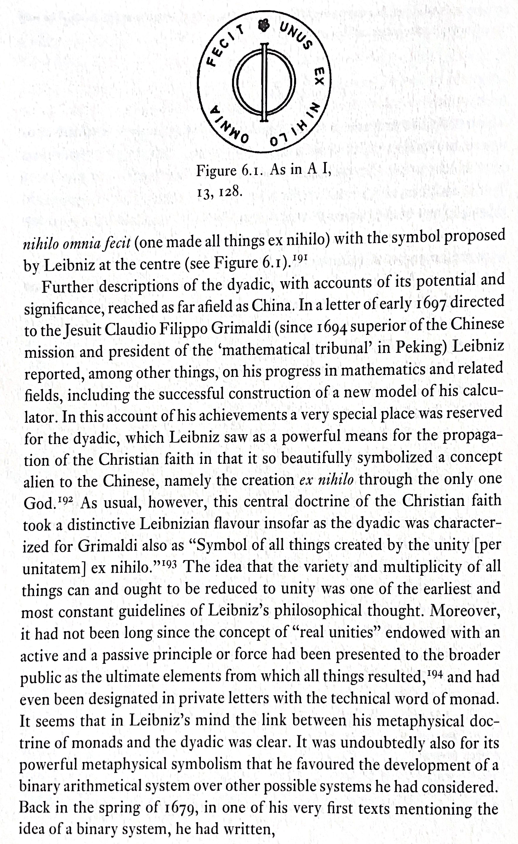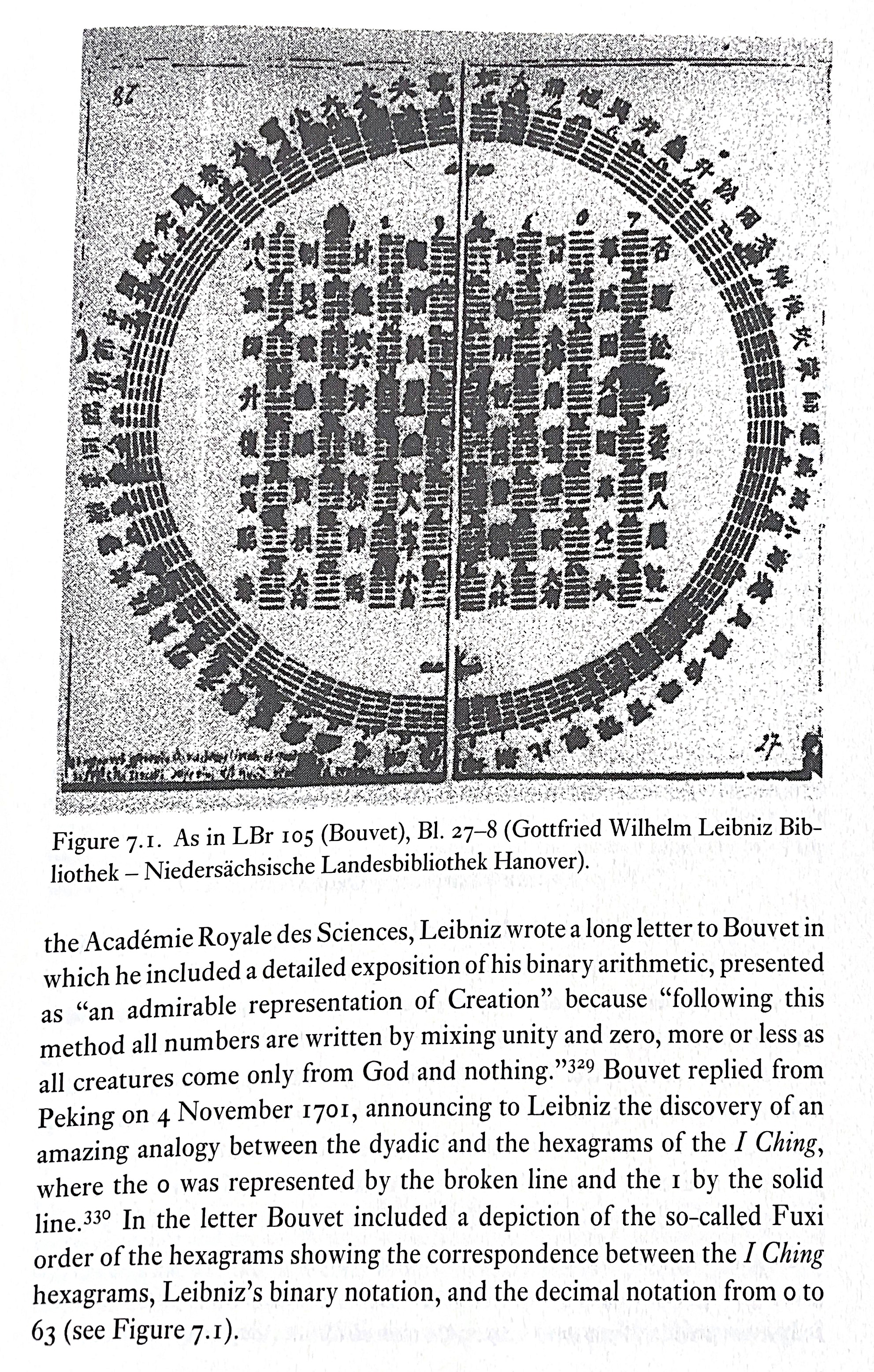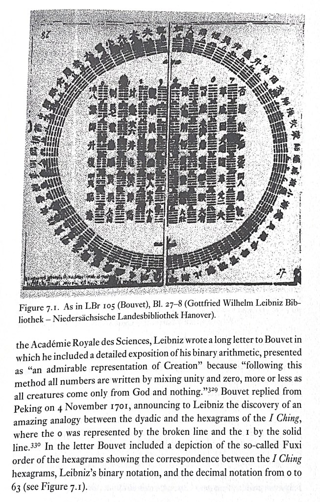 “Leibniz escreveu uma longa carta para Bouvet na qual ele incluiu uma exposição detalhada da sua aritmética binária, apresentada como uma ‘admirável representação da Criação’ porque ‘seguindo este método todos os números são expressos pela mistura da unidade com o zero, mais ou menos como todas as criaturas provém apenas de Deus e do nada.’ Bouvet respondeu de Pequim em 4 de Novembro de 1701, anunciando para Leibniz a descoberta de uma fantástica analogia entre o diádico e os hexagramas do I Ching, onde o zero era representado pela linha dividida e o um pela linha contínua. Na carta Bouvet incluiu uma representação da assim chamada ordem Fuxi dos hexagramas mostrando a correspondência entre o I Ching, a notação binária de Leibniz, e a notação decimal de zero a sessenta e três.”