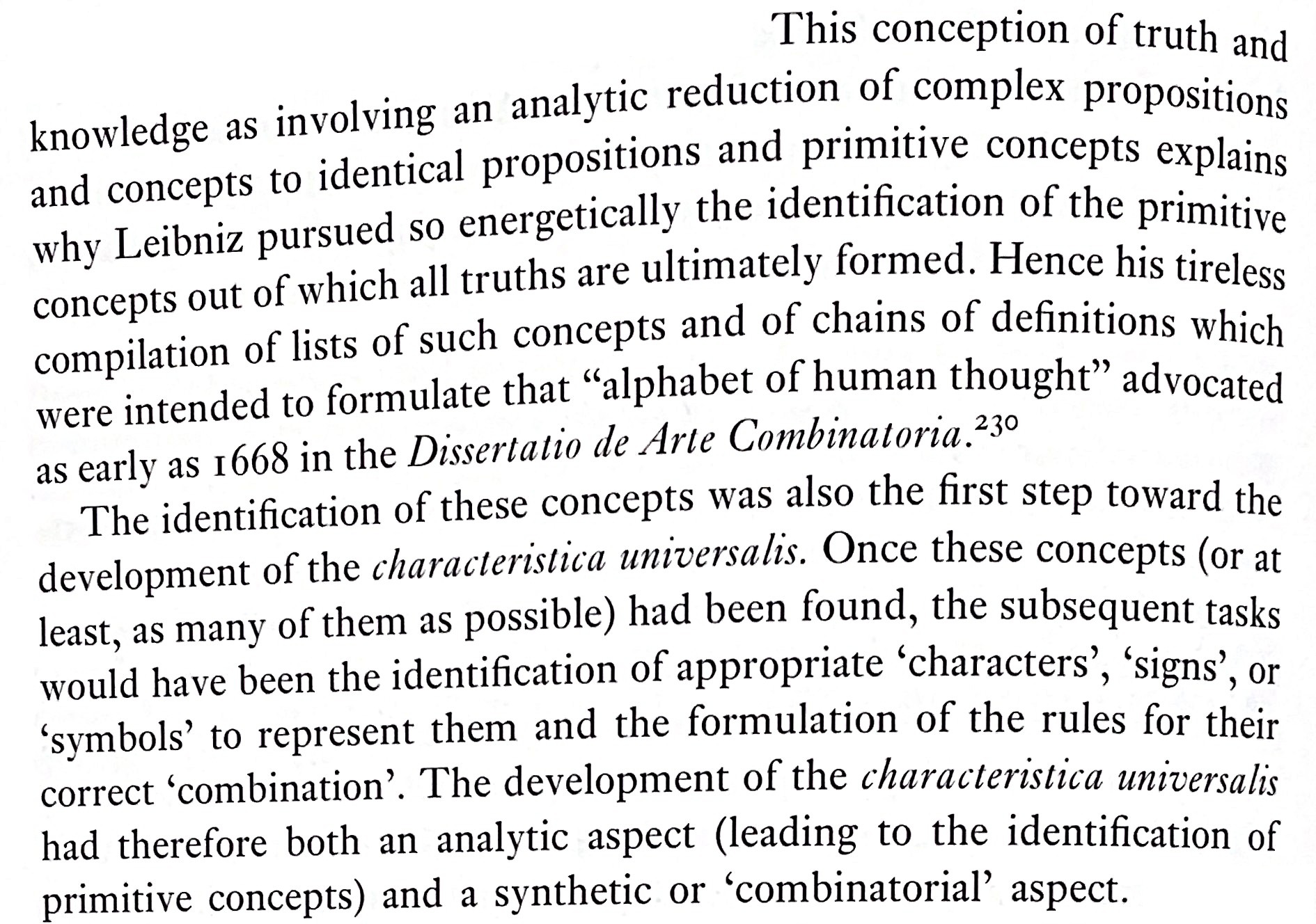“Essa concepção da verdade e do conhecimento como envolvendo uma redução analítica de proposições e conceitos complexos à proposições idênticas e conceitos primitivos explica porque Leibniz perseguiu tão energicamente a identificação dos conceitos primitivos das quais todas as verdades são formadas em última análise. Daí a sua incansável compilação de listas de tais conceitos e de cadeias de definições que eram dedicadas para formar o ‘alfabeto do pensamento humano’ defendido desde pelo menos 1668 na Dissertatio de Arte Combinatoria.