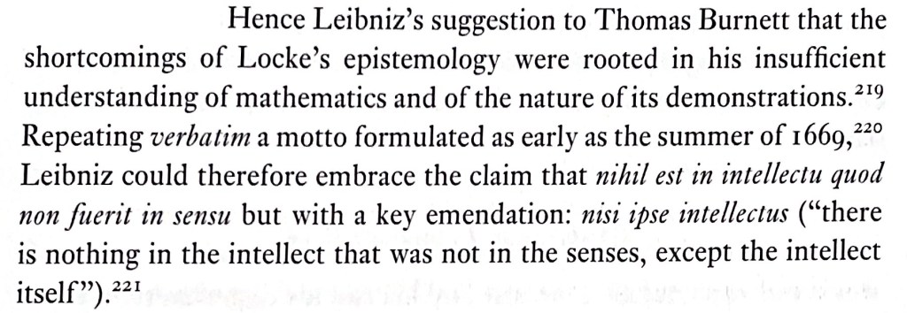 Aqui o que importa é a expressão de Leibniz em resposta ao trabalho de John Locke: “não há nada no intelecto que não estivesse antes nos sentidos, exceto pelo próprio intelecto“. É uma correção educada da estupidez de uma filosofia materialista, assim como depois ele corrigiria Berkeley ao afirmar que o corpo pode não existir como substancial por si mesmo, mas não deixa de existir como objeto da nossa percepção, o que é suficiente para que exista de algum modo, algo óbvio. Percebe-se assim como Leibniz estava filosoficamente posicionado como um adulto no meio de crianças, tentando ensinar a ler, escrever, pensar, etc. Mas talvez o seu primeiro aluno realmente capaz viria só com Kant.