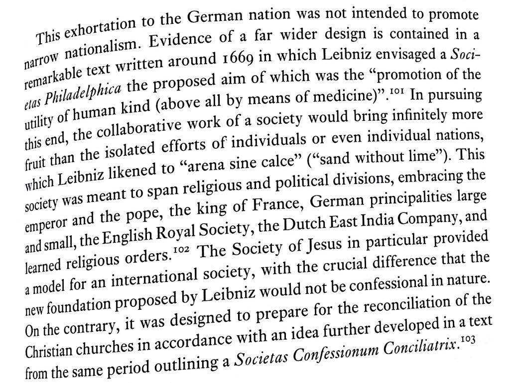 “Essa exortação da nação alemã não estava dirigida a promover um nacionalismo estreito. Evidência de um desígnio muito mais abrangente está contida num texto memorável escrito por volta de 1669 em que Leibniz concebeu na Societas Philadelphica o objetivo proposto que era o de ‘promover a utilidade para a humanidade (acima de tudo através da medicina)’. Perseguindo este objetivo, o trabalho colaborativo de uma sociedade traria infinitamente mais frutos do que os esforços de indivíduos ou até mesmo de nações individuais, que Leibniz comparava a ‘arena sine calce’ (‘areia sem cal’). Essa sociedade deveria abarcar divisões religiosas e políticas, abarcando o Imperador e o Papa, o Rei da França, os grandes e pequenos principados alemães, a inglesa Royal Society, a Companhia Holandesa das Índias Orientais, e as ordens religiosas de estudos. A Sociedade de Jesus em particular provia um modelo para uma sociedade internacional, com a diferença crucial de que a nova fundação proposta por Leibniz não teria natureza confessional. Ao contrário, era modelada para preparar a reconciliação das Igrejas cristãs de acordo com uma idéia mais desenvolvida num texto do mesmo período que descrevia a Societas Confessionum Conciliatrix.”