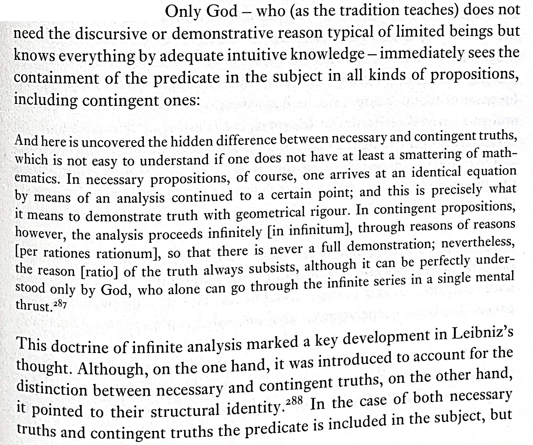 Essa doutrina da análise infinita marcou um desenvolvimento chave no pensamento de Leibniz. Embora, por um lado, ela foi introduzida para dar conta da distinção entre verdades necessárias e contingentes, por outro lado, ela apontava para a sua identidade estrutural. No caso de ambas as verdades, necessárias e contingentes, o predicado está contido no sujeito, mas enquanto a demonstração dessa contenção está disponível para nós apenas no caso das verdades necessárias, tal demonstração não é possível no caso das verdades contingentes desde que elas envolvem o infinito. Este é o motivo pelo qual seres humanos nunca poderão conceber o conceito completo correspondente a uma substância individual, e porque o adequado conhecimento de substâncias individuais está disponível apenas para a mente infinita de Deus.”