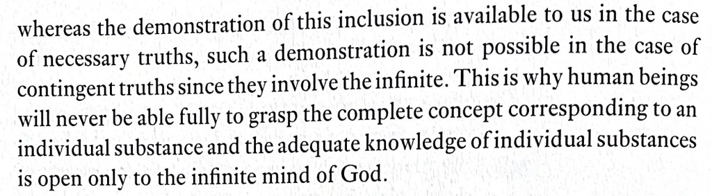 ‘E aqui se descobre a diferença escondida entre verdades necessárias e contingentes, o que não é fácil de entender para quem não entende ao menos os rudimentos da matemática. Em proposições necessárias, é claro, qualquer um alcança uma equação idêntica pelo meio da análise continuada até certo ponto; e isso é precisamente o que significa demonstrar a verdade com rigor geométrico. Nas proposições contingentes, porém, a análise procede infinitamente [in infinitum], através de razões de razões [per rationes rationum], de maneira que nunca há uma demonstração total; ainda assim, a razão [ratio] da verdade sempre subsiste, ainda que só possa ser conhecida perfeitamente apenas por Deus, que sozinho pode percorrer a série infinita numa intuição singular.’