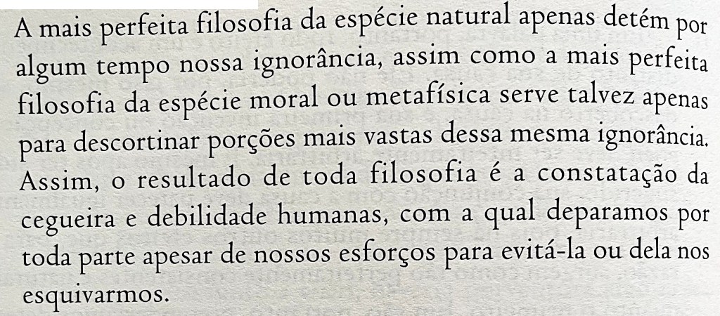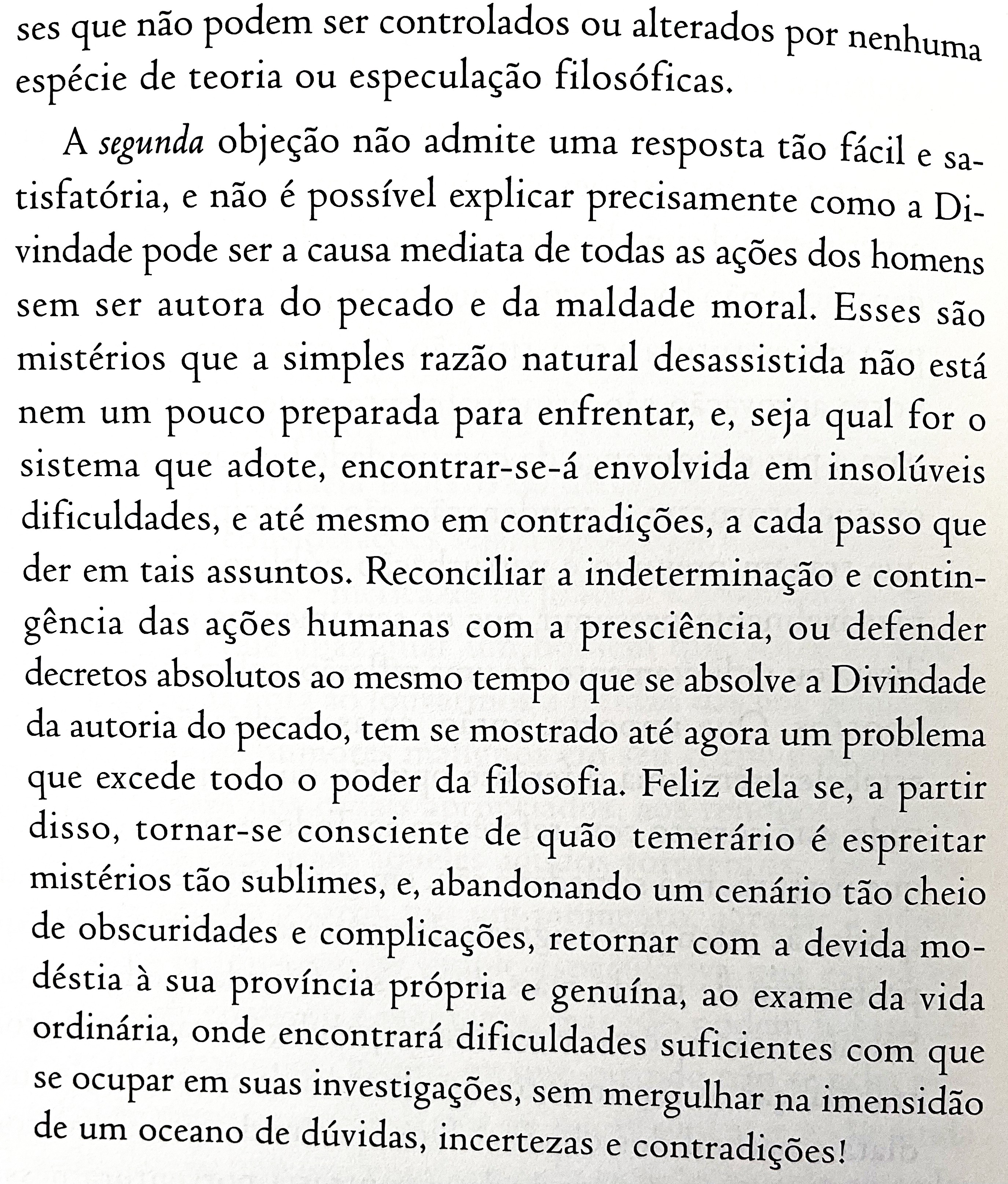 Hume defenderá um ceticismo que pode parecer exagerado, mas que não deveria assustar os cristãos que realmente vivem pela Graça. Pode não dar testemunho da Presença, ou do Discernimento, mas não faz ao seu modo um elogio da Humildade, da Soberania e até da Vigilância?
