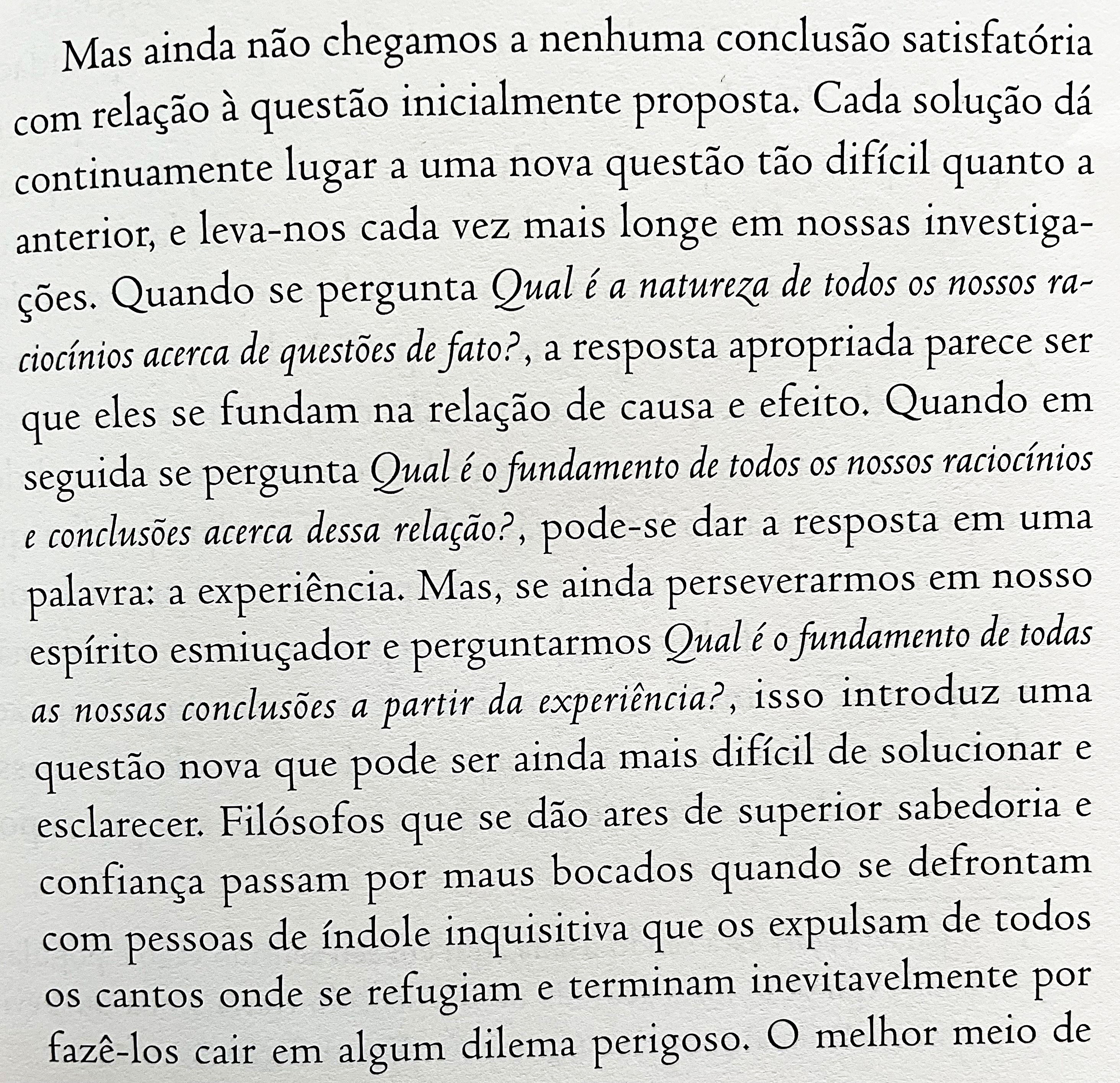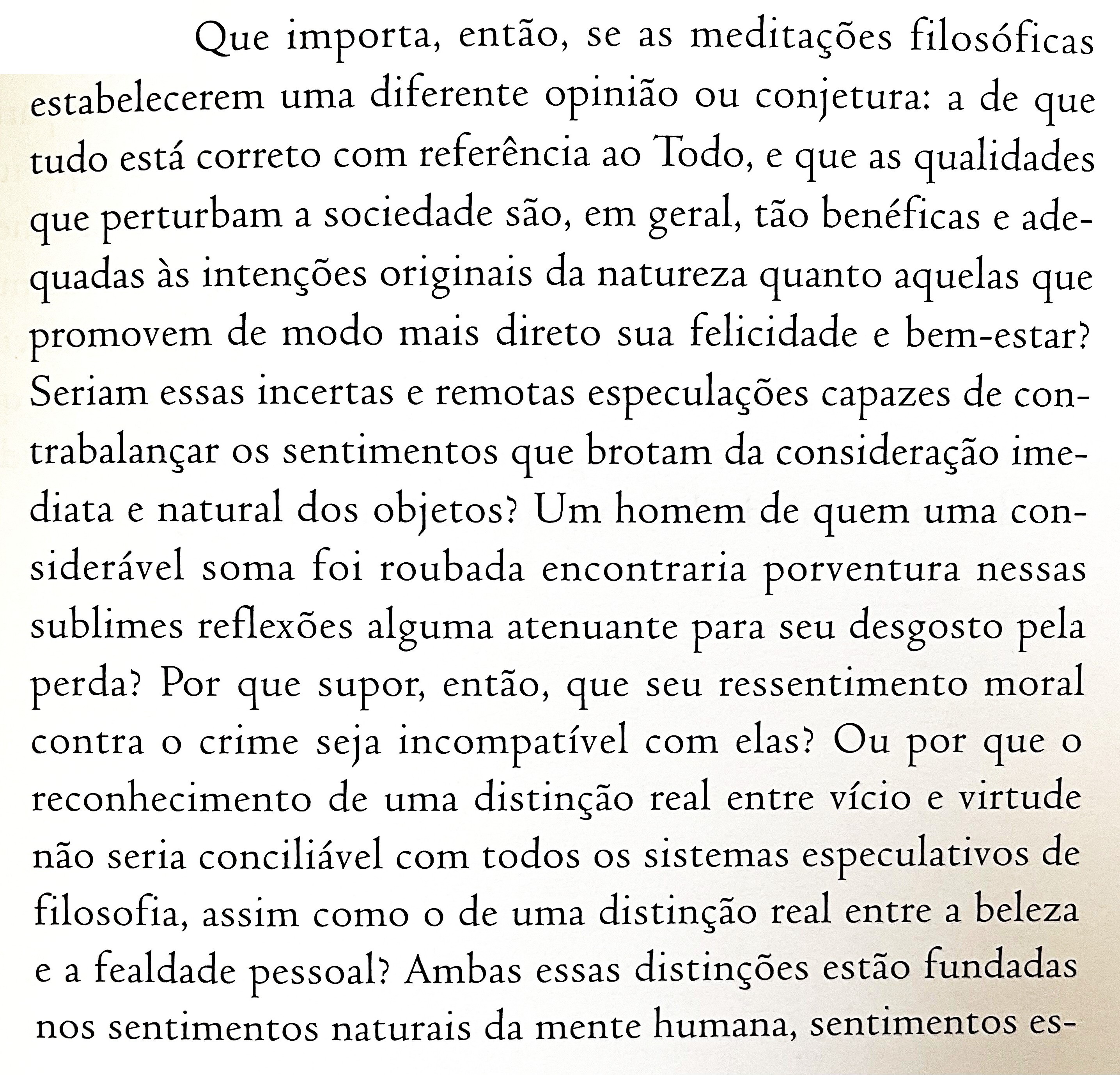 À luz de outros investigadores mais puramente filosóficos, ou metafísicos, Hume parece um pensador meio pequeno, como se esse tipo de obra que fez tivesse que manter toda a sociedade humana operando sob o mesmo pacto de sempre, o que obviamente impede a mais plena liberdade de pensamento. Por onde vai o autor quer arrastar consigo o seu império terrestre, o que é, cá entre nós, uma âncora muito pesada. Poucas vezes analisei uma filosofia tão obviamente ocupada com a Legitimação da Mistura. E como poderia ser diferente, com uma teoria que preza pelo valor do hábito e dos costumes? Ora, eu também posso prezar por essas coisas até certo ponto, mas meu entusiasmo acaba quando a utilidade imediata (para usar outro recurso do autor) cessa de valer, isto é, para além da preservação da paz. O filósofo não precisa de paz para manter tudo como está, mas para descobrir o que as coisas significam mesmo que isso custe desconfiar da bondade dos seus costumes. O costume, portanto, pode ser útil, mas não é uma bússola moral e nem intelectual. É somente algo conveniente, pois nos liberta da falta de moderação e autodomínio dos outros seres humanos.