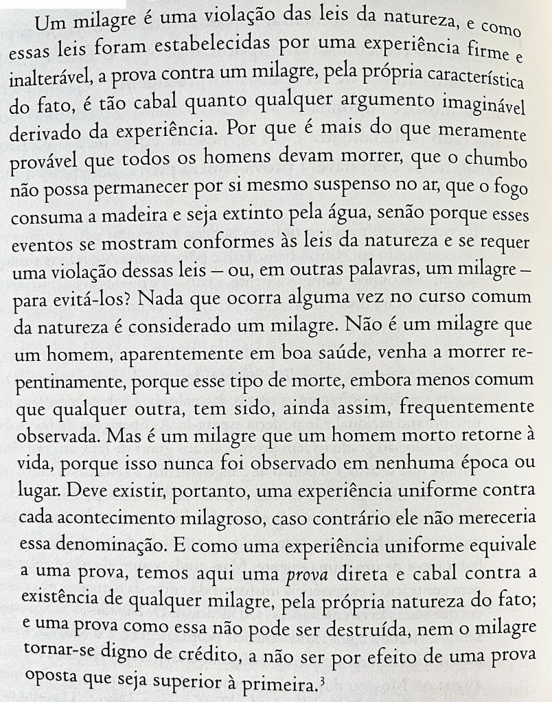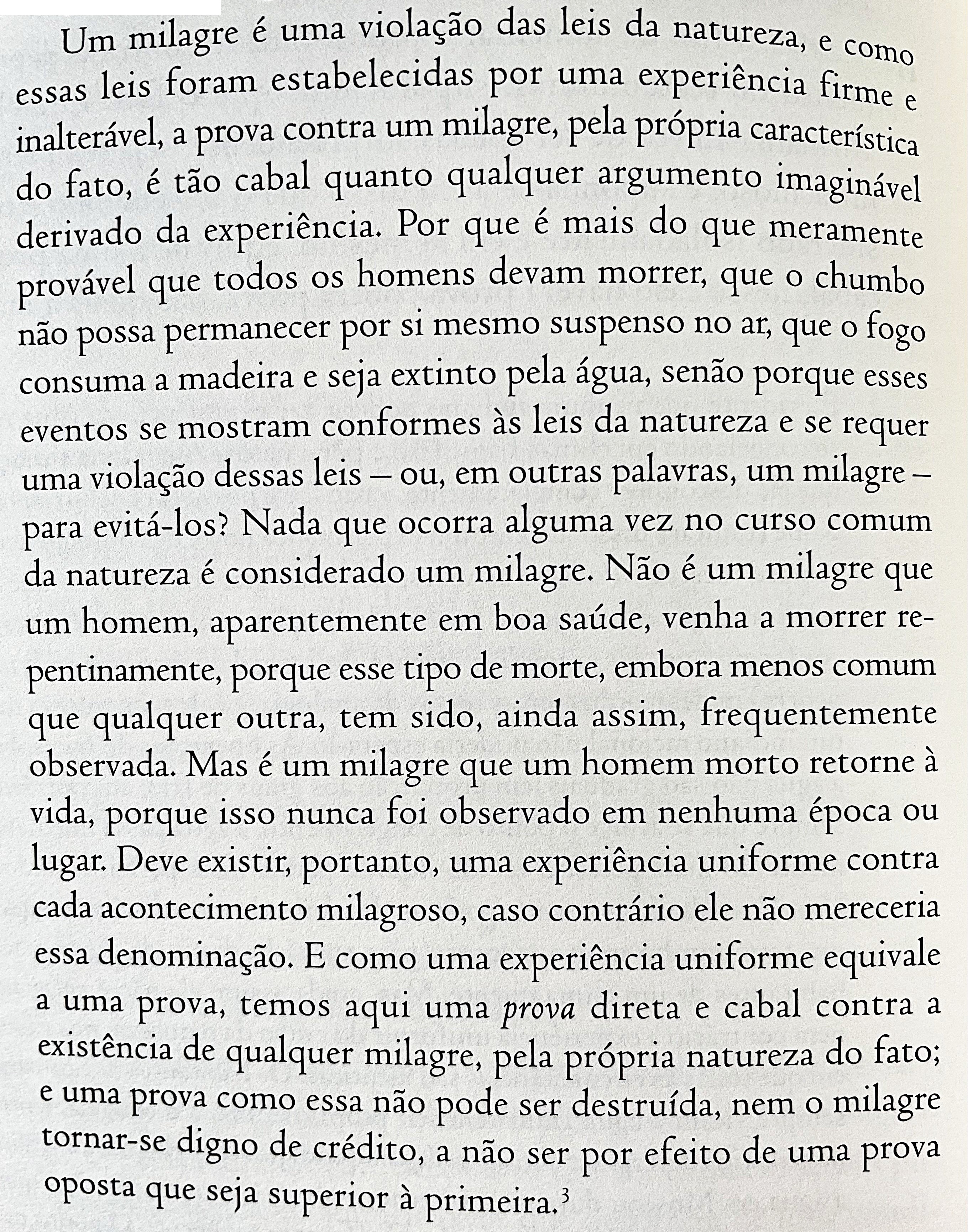 A seção 10 das Investigações de Hume, dedicadas a esse tema do milagre, parecem ter sido produzidas de modo menos natural que as seções anteriores. Como se a conclusão já estivesse pronta de antemão, e só faltasse encaixar as peças. Esse método sempre deixa sinais da sua artificialidade, resíduos do efeito da falácia de petição de princípio. Ora, chamar de “prova” uma experiência uniforme é um argumento de elasticidade excessiva. Senão vejamos: a única maneira mais infalível de transformar a experiência uniforme em prova do que é normativo é a suposição de um ordenamento superior que o determinasse de modo autoritativo. Caso contrário, teríamos apenas as convenções dos homens. O que quer dizer que se a experiência uniforme aprendida por hábito significa algo mais que uma mera convenção humana, é porque é sinal de um poder superior, como o de uma Providência que instalou essa realidade com vistas a determinados bens. E essa instância transcendente às leis naturais seria justamente capacitada para causar quaisquer rompimentos com a regularidade das coisas, por possuir o domínio da causa final que orientou o seu ordenamento original em primeiro lugar. Prova, então, seria suficiente apenas com a crença de uma origem infalível das leis naturais, uma fonte que teria que transcender essa instância, isto é, uma autoridade divina. De novo encontramos o autor apelando para safadezas?