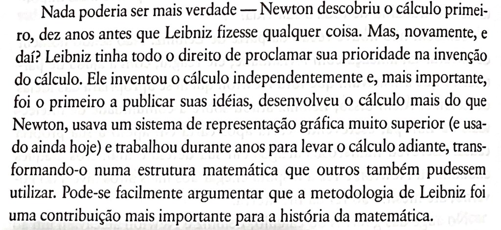 Para além do que pude observar num livro anterior sobre o tema da disputa sobre a invenção do Cálculo, parece que a polêmica foi mais alimentada pela ação dos do lado de Dover do que do lado de Calais. Leibniz simplesmente tinha mais o que fazer. Esta pode ser a diferença decisiva: Newton parece se ocupar trabalhando para a glória de Newton, enquanto Leibniz parece se ocupar no trabalho para a glória de Deus. É verdade que o alemão já repousava na fama de ter inventado o Cálculo, mas ele aceitava a autoria paralela de Newton. Este último é que não podia aceitar não ter a precedência. Se há vaidades dos dois lados, convém compreender quem foi vaidoso primeiro. E, se da parte de Newton seria tão importante a prioridade temporal, por que raios ele não publicou seu estudo completo antes do alemão?